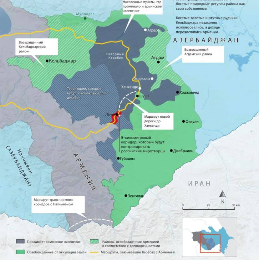 Получается армяне уже передали 2 района - Агдамский и Кельбаджарский. Остался Лачинский. Там до 1 декабря должны передать если я не ошибаюсь. И последний штрих - прокладка новой дороги Лачин-Ханкенди в обход Шуши. Но на это дается три года.