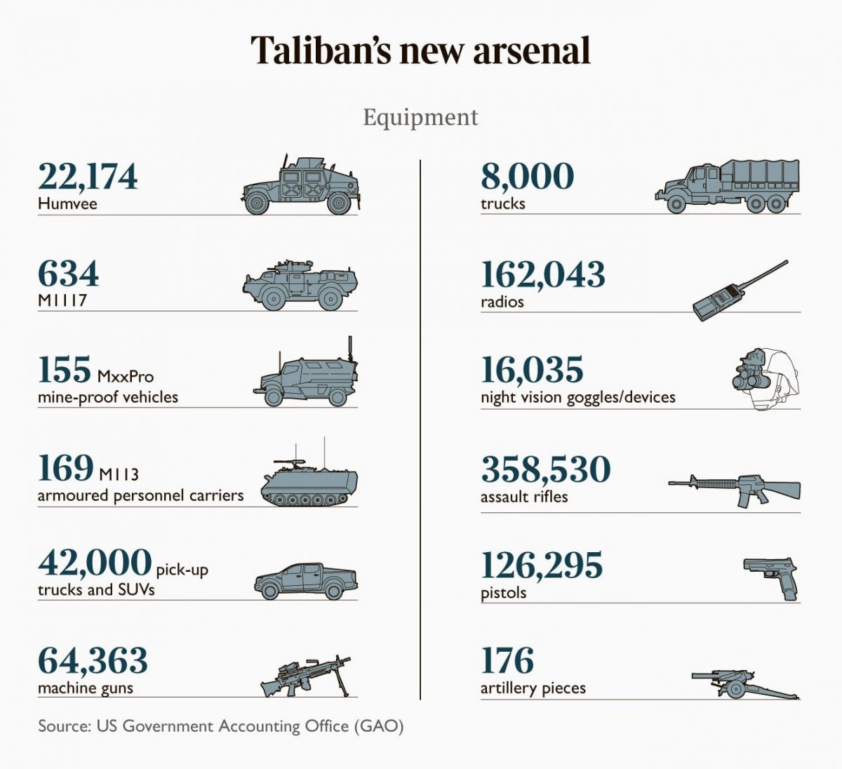 В период с 2003 по 2016 год США разгрузили огромное количество военной техники афганским силам, с которыми они сражались вместе: 358 530 винтовок различных марок, более 64 000 пулеметов, 25 327 гранатометов и 22 174 Humvee (вездеходы), согласно данным Отчет об ответственности правительства США.