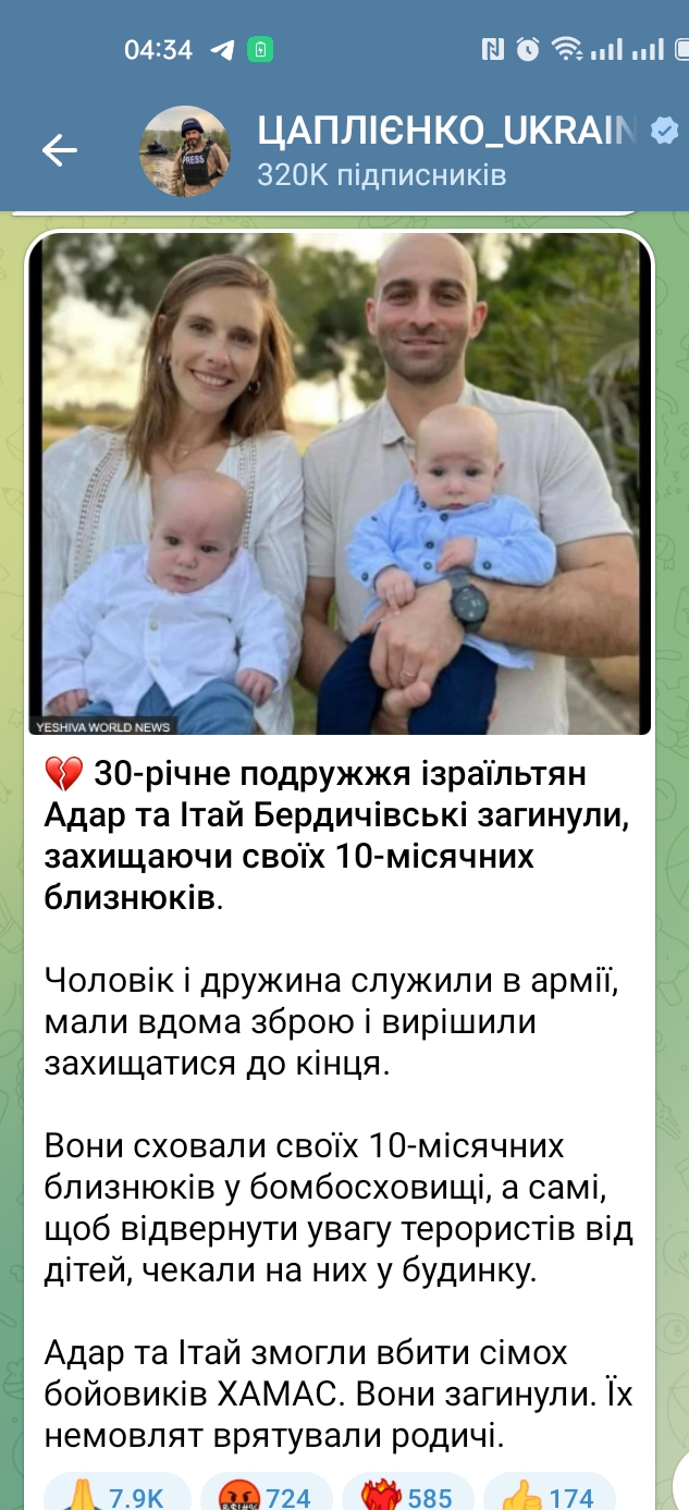 30-річне подружжя ізраїльтян Адар та Ітай Бердичівські загинули, захищаючи своїх 10-місячних близнюків. Чоловік і дружина служили в армії, мали вдома зброю і вирішили захищатися до кінця. Вони сховали своїх 10-місячних близнюків у бомбосховищі, а самі, щоб відвернути увагу терористів від дітей, чекали на них у будинку. Адар та Ітай змогли вбити сімох бойовиків ХАМАС. Вони загинули. Їх немовлят врятували родичі.