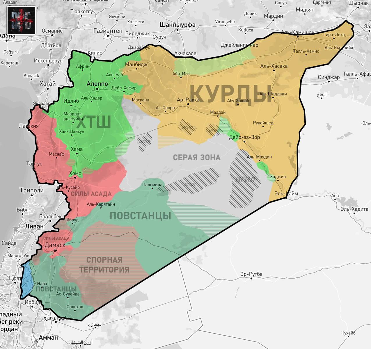 Ох уж ці європейці. В них кругом джихадисти та ісламісти, а ті хто на короткому ціпку в них вільна-народна армія Сирії. Малювати всіх повставців у один колір це маячня. SNA контролюється Турцією, а FSyA контролюється США. Ще у США є кишенькові PKK/PDY/YPG/SDF, тобто курди. Ці курди мають дружні стосунки з Асадом. І на вашій карті не позначені повстання арабів проти курдів біля Дей-аз-Заур. І найголовніше CMO ніким не контролюється і підтримується народом. Саме повстання на півдні Ahrar Horan та Suwayda спочатку було незалежним, а потім перейшло на бік CMO.