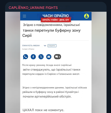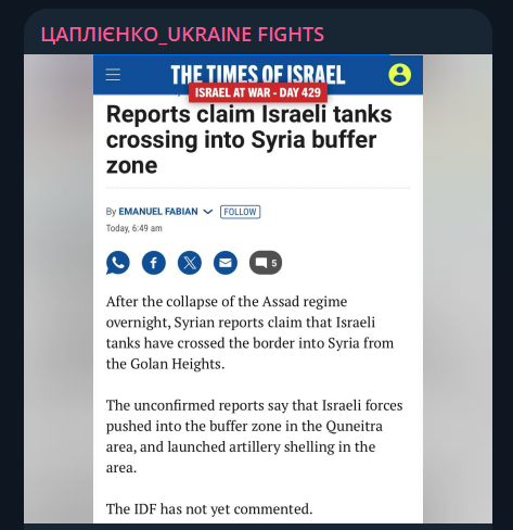 Асад програв. Те, що починалося як успішний прорив опозиції на півночі країни, перетворилося на повний розпад режиму та загальнонаціональне повстання. За три доби місцеві міліції на півдні країни, в Дараа та Сувейді, зуміли роззброїти урядові війська та захопити пункти дислокації механізованих частин зі складами озброєнь, після чого вирушити на столицю. Не маючи нормального командування та озброєнь окрім трофейних, місцеве населення вже самостійно вийшло на околиці Дамаску. В той же час, контрольовані та навчені американцями на базі Ат-Танф з'єднання Вільної Сирійської Армії зробили швидкий стрибок пустелею від кордонів Йорданії та встановили контроль над Пальмірою й заходять у Східну Гуту, передмісті Дамаску що роками чинило відчайдушний спротив в повному оточенні під хімічними атаками. Паралельно, підрозділи Хайат Тахрір аш-Шам зломили оборону урядових військ в стратегічно важливому м. Хомс та починають зачистку районів міста, звільняючи політичних ув'язнених з катівень режиму, що роками не бачили свободи. Тільки турки й контрольовані ними підрозділи вирішили, що саме зараз — найкращий момент для нападу на курдів, котрі разом з арабськими міліціями намагаються встановити контроль над цілими районами, котрі в повному складі полишили урядові війська. Ну, кожному своє. Режим не встиг консолідувати сили, а його союзники — врятувати його. Й, якщо оборона Хомса ще якось створювала надію режиму на те щоб встояти, повстання в Дараа стало останнім цвяхом в домовину Асада. Наразі залишки військ, поки коридор існує, намагаються відійти в прибережні алавітські регіони — Латакію та Тартус, де розміщені російські військові бази. Сили опозиції досі не починали наступу на ці регіони через ризики відчайдушного спротиву місцевих міліцій, але після зачистки Дамаску та консолідації сил перед новим урядом буде стояти задача встановлення контролю й над ними. Не вийде уникнути важких перемовин та зіткнень й курдам, які наразі контролюють майже всі залишки нафтогазової промисловості Сирії, й котрі будуть вимушені ділитися. Але це буде в майбутньому. Й це буде без Асада, без Путіна та аятолл. Для них майбутнє закінчується.