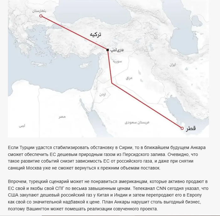 Турция объявила о возобновлении проекта транспортировки газа из Катара через Сирию и Турцию в Европу. При Асаде это было для Анкары никак не возможно. Асада нет, нет и препятствия. Если проект осуществится, то Турция станет крупнейшей газовой трубой в Европу, кран от которой будет в руках у Эрдогана.