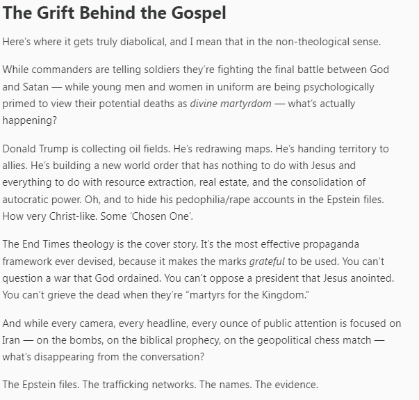 Почитайте, переведите: Обман, скрывающийся за Евангелием Вот тут начинается настоящий дьявольский беспредел, и я имею в виду это в нетеологическом смысле. В то время как командиры говорят солдатам, что они сражаются в последней битве между Богом и Сатаной, — в то время как молодых мужчин и женщин в военной форме психологически готовят к тому, чтобы они воспринимали свою потенциальную смерть как божественное мученичество, — что же происходит на самом деле? Дональд Трамп захватывает нефтяные месторождения. Он перекраивает карты. Он раздает территории союзникам. Он строит новый мировой порядок, который не имеет ничего общего с Иисусом и полностью связан с добычей ресурсов, недвижимостью и укреплением автократической власти. Ах да, и еще он скрывает свои рассказы о педофилии/изнасилованиях в файлах Эпштейна. Как же это по-христиански. Какой-то «Избранный». Теология последних времен — это прикрытие. Это самая эффективная пропагандистская схема из когда-либо придуманных, потому что она заставляет жертв быть благодарными за то, что их используют. Нельзя подвергать сомнению войну, которую предопределил Бог. Нельзя противостоять президенту, которого помазал Иисус. Нельзя оплакивать умерших, когда они «мученики Царства». И пока все камеры, все заголовки, все внимание общественности сосредоточены на Иране — на бомбах, на библейском пророчестве, на геополитической шахматной партии — что исчезает из обсуждения? Досье Эпштейна. Сети торговли людьми. Имена. Доказательства.
