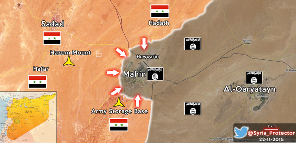 последние дни шли ожесточенные бои лоялов и игиловцами за город Махин(Мхин). Этот населенный пункт расположен в 85 км к юго-востоку от провинциального центра Хомса. Он играет ключевую роль в контроле над регионом Восточный Калямун В начале ноября ребелы из местных группировок нарушили перемирие в районе, которое поддерживалось с 2013 года, и перешли на сторону ИГИЛ. Лоялы понесли потери и отступили к соседнему христианскому городу Садад. Потеря Мхина создала угрозу перекрытия транспортной артерии между Дамаском и Хомсом, но в субботу после мощной артподготовки лоялы выбили боевиков с расположенных в окрестностях Мхина высот и восстановили контроль над утраченными позициями. Это решило исход сражения, продолжавшегося 20 дней. Сейчас лоялисты преследуют противника к юго-востоку от Хомса Лейт Фадел 22 ноября 2015 В субботу вечером национальных сил обороны (NDF) из Садада в координации с сирийской социальной националистической партии (SSNP) и Ассирийской “Gozarto защиты сил” (Sootooro) начали мощное наступление на Джебель-Махин (гору Махин) против оборонительных позиций ИГИЛ вдоль этой небольшой горы в пустынях на востоке провинции Хомс. После ожесточенных боях с боевиками ИГИЛ, засевшими в горах Махин и садах Махин, национальные силы обороны и их союзники преодолели оборону террористической группировки и ввели полный контроль над этим непростым районом с видом на стратегический город Махин. С Джебель-Махин под их контролем национальные силы обороны и их союзники в настоящее время контролируют всю местность к северу от города Махин, в том числе в селах Al-Hadath и Hawareen, которые были захвачены в ходе вчерашнего контрнаступления, отодвинувшего террористические группировки от сирийского христианского города Садад. Если сирийские Вооруженные силы смогут отбить Махин, они будут в пределах досягаемости от города Quraytayn, который был захвачен ИГИЛ в начале августа после двух дней сражения с национальными силами обороны. короче для лоялов успех у Мхина дает благоприятные возможности для продвижения в направлении Пальмиры и снимают угрозу трассе Дамаск-Хомс. фотки лоялов
