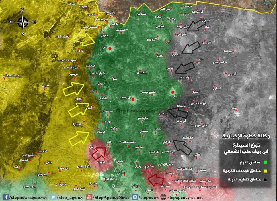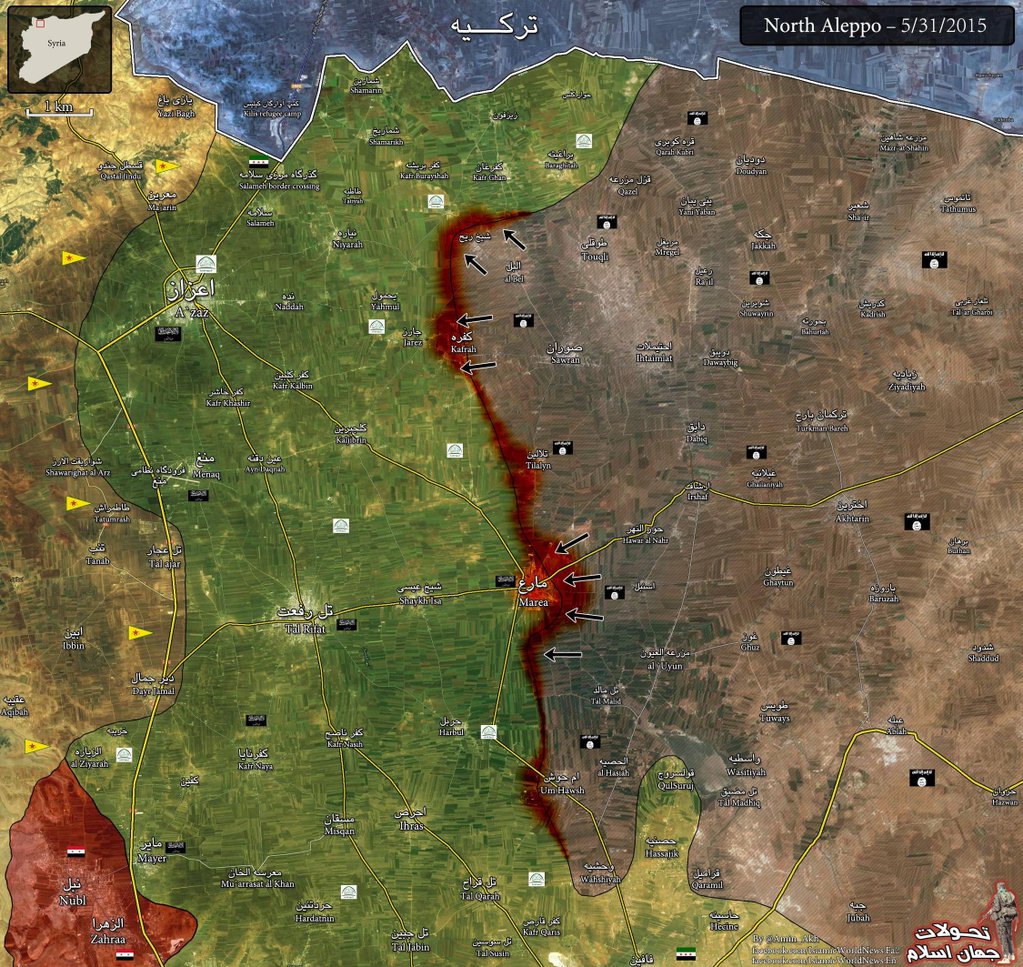 В дополнение моей ссылки, где ССА с курдами воюют против Нусры и Исламского фронта, которые прячутся под вывеской "ССА", карты: