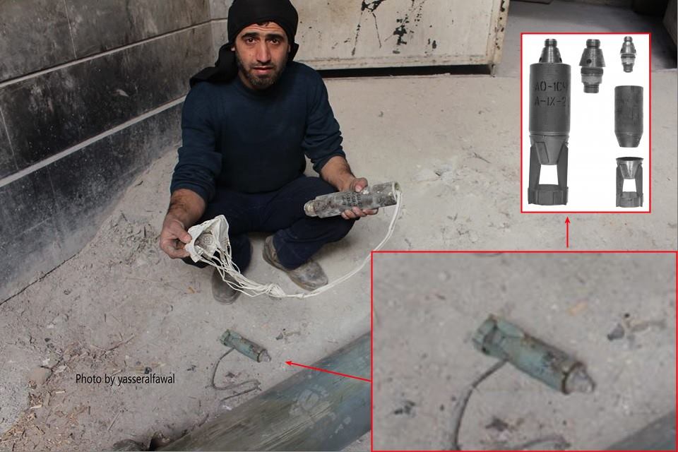 ВКС РФ вчера 13 декабря 2015 нанесли авиаудары по городу Douma. В результате авиаударов погибло более 40 человек, более 200 раненых. На одной из фотографий с места событий был идентифицирован осколочный суббоеприпас АО-1СЧ для кассетной бомбы РБК-250-275. Фотография для идентификации взята отсюда:https://www.facebook.com/yasserdouma1/posts/557282794425697 Напомню: Последствия авиаудара, строго 18+: https://twitter.com/AEJKhalil/status/676039552293801984 Первые видео с мест авиударов 18+: https://twitter.com/AEJKhalil/status/676043949069500417 https://twitter.com/AEJKhalil/status/676044846436601856 https://twitter.com/AEJKhalil/status/676045615713882112