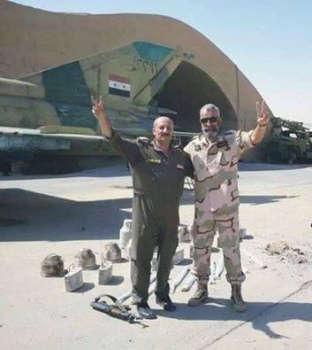 фото старое.Не это событие.россияне пишут так Для отражения атаки с военного аэродрома в городе Аль-Камашли были подняты самолёты сирийских ВВС. При нанесении ударов по боевикам ИГИЛ один из истребителей МиГ-23 был сбит из зенитной установки. Погиб лётчик, полковник Али Хамзат.