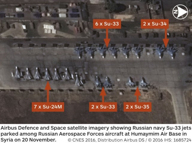 Су-33 с "Адмирала Кузнецова" на авиабазе Хмеймим Датированный 20 ноября 2016 года космический снимок используемой группировкой российской авиации сирийской авиабазы Хмеймим (аэропорт Базель аль-Асад) близ Латакии, показывающий присутствие восьми корабельных истребителей Су-33 (с) CNES / Airbus Defence and Space (via Jane's) Напомним, что тяжелый авианесущий крейсер вышел в поход в Средиземное море, имея на борту десять истребителей Су-33 и четыре МиГ-29КР/КУБР (причем один из МиГ-29КР, был, как известно, потерян 13 ноября). Журнал цитирует неназванного "высокопоставленного британского офицера в Сирии", который утверждает, что большая часть боевых вылетов по целям в Сирии осуществлялась самолетами Су-33 и МиГ-29КР именно с авиабазы Хмеймим, а не с "Адмирала Кузнецова". Опубликованный журналом снимок сделан спутником серии SPOT компании Airbus Defence and Space (непосредственно получен французским Национальным центром космических исследований - Centre National d'Etudes Spatiales - CNES).