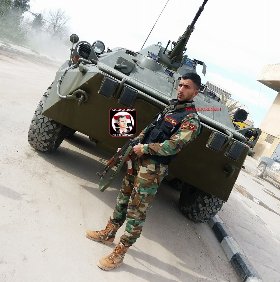 Сирийская армия вооружена бронетранспортерами БТР-80 самой последней модификации. До недавнего времени трудно было найти качественные фотографии этих боевых машин в зоне боевых действий. И вот в Сети появилось изображение одной из "восьмидесяток", находящихся на вооружении одного из самых боеспособных и элитных формирований сирийских сухопутных войск - четвертой танковой дивизии. Как видно на фото, в распоряжении сирийцев БТР-80 с комбинированным двухканальным дневно-ночным прицелом ТКН-4ГА, который смонтирован в башне БПУ-1, вооруженной 14,5-мм пулеметом КПВТ и 7,62-мм ПКТМ. В ночных условиях этот прицел может уверенно распознавать цели на дальностях в 1200 м и кроме наземных целей способен поражать низколетящие объекты. Для подсветки используется лазерный малогабаритный прожектор типа ПЛ-1 (правда, на фото его не видно из-за пулемета КПВТ). Прицел ТКН-4ГА, принятый на вооружение в 2007 году, в настоящее время устанавливается на БТР-82.