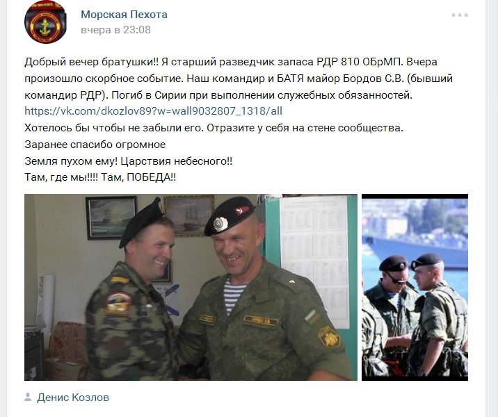 Вдова убитого в Сирии майора Бордова рассказала подробности его гибели Вдова убитого в Сирии российского майора Сергея Бордова рассказала подробности гибели супруга. По ее словам, вместе с ним погибли двое сирийцев и российский офицер Российский майор Сергей Бордов погиб в Сирии при взрыве ракеты из американского противотанкового ракетного комплекса (ПТРК) TOW, рассказала РБК вдова военнослужащего Виталина Бордова со ссылкой на рассказ сослуживцев мужа. «С ним погибли двое сирийцев и российский офицер, предположительно из Оренбурга», — рассказала вдова. В пресс-службе Минобороны пока не ответили на запрос РБК о комментарии по поводу гибели в Сирии второго офицера. Это была вторая сирийская поездка офицера, утверждает его вдова. В первый раз Бордов уехал 29 сентября 2015 года на 2,5 месяца. «Тогда он ехал со своей развед-десантной ротой, которой командовал. В этот раз он поехал в качестве советника», — говорит Бордова. По ее словам, супруг был трижды представлен к ордену Мужества — два раза за Чечню и один за Крым. «За крымскую весну еще получил майора — министр обороны присвоил звание за старые заслуги, ведь муж всю жизнь в разведке. После его смерти мне сообщили в бригаде, что представят к награде, но к какой именно, никто не знает. Никто из властей про помощь не говорил — компенсация вроде положена, но за столько лет он даже на квартиру не заработал», — рассказывает вдова. По ее словам, муж прослужил свыше 20 лет в морской пехоте. Вдова рассказала, а арабы показали...