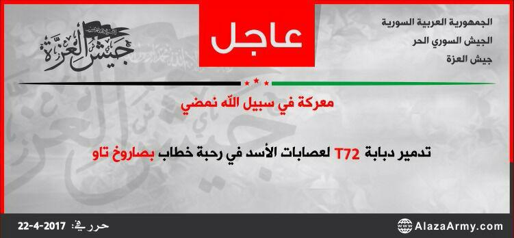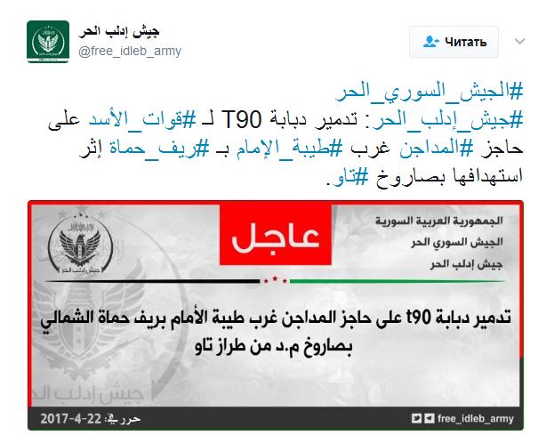 пишут что ребелы (свободная армия Идлиб) на блокпосту из TOW заптурили Т90 в Мэдден Гарб КПП Тайеб Аль-Имам Риф, Хама а еще Т72 поджарили а еще в западном Алеппо уничтожили еще один Т72 - возле артиллерийской базы