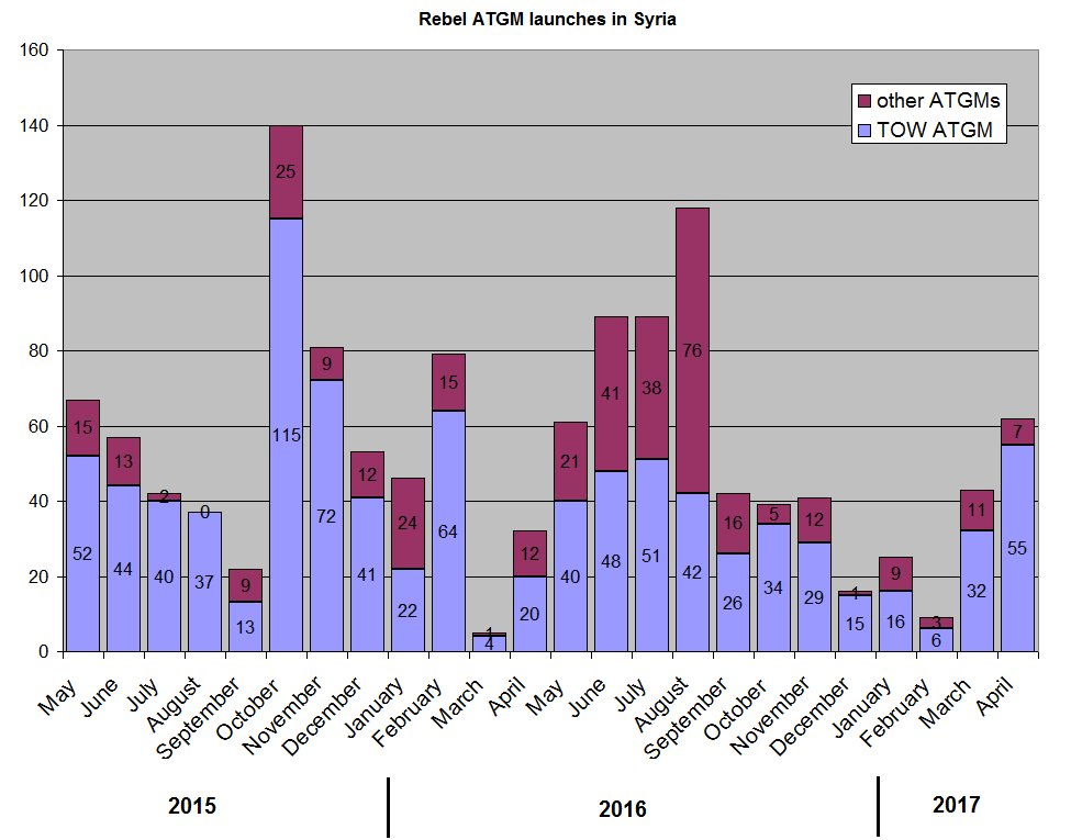 минутка статистики: https://twitter.com/QalaatAlMudiq/status/858735175278133251 Rebels fired 68 #ATGM|s since start of #Hama Battle on 21st March. - 11 days without launch. - peak on 22nd April: 10 launches. Rebels fired 65 #ATGM|s in April, highest since Summer 2016 - 75% in #Hama - 89% are #TOW - 38% by #FSA Jaish Izza - 36% targets are armours https://twitter.com/QalaatAlMudiq/status/858733749286162432