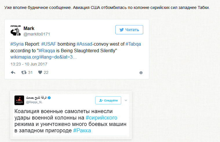 Асадиты четвертый раз наступили на одни и те же грабли. Но им жутко нравиться. "Международная коалиция, возглавляемая США, нанесла еще одну, четвертую, серию авиаударов по проправительственным силам Сирии в Ат-Танфе. В результате действий авиации были уничтожены 30 автомобилей". http://diana-mihailova.livejournal.com/701551.html