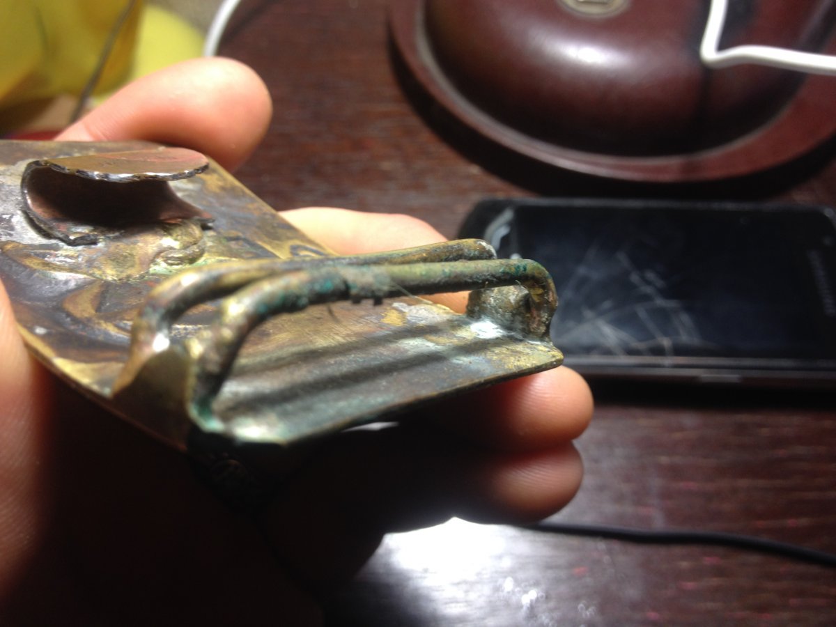 Вот такая пряжка выходилась. Под правую руку, клейм нет. Сама медная с покрытием латунью.