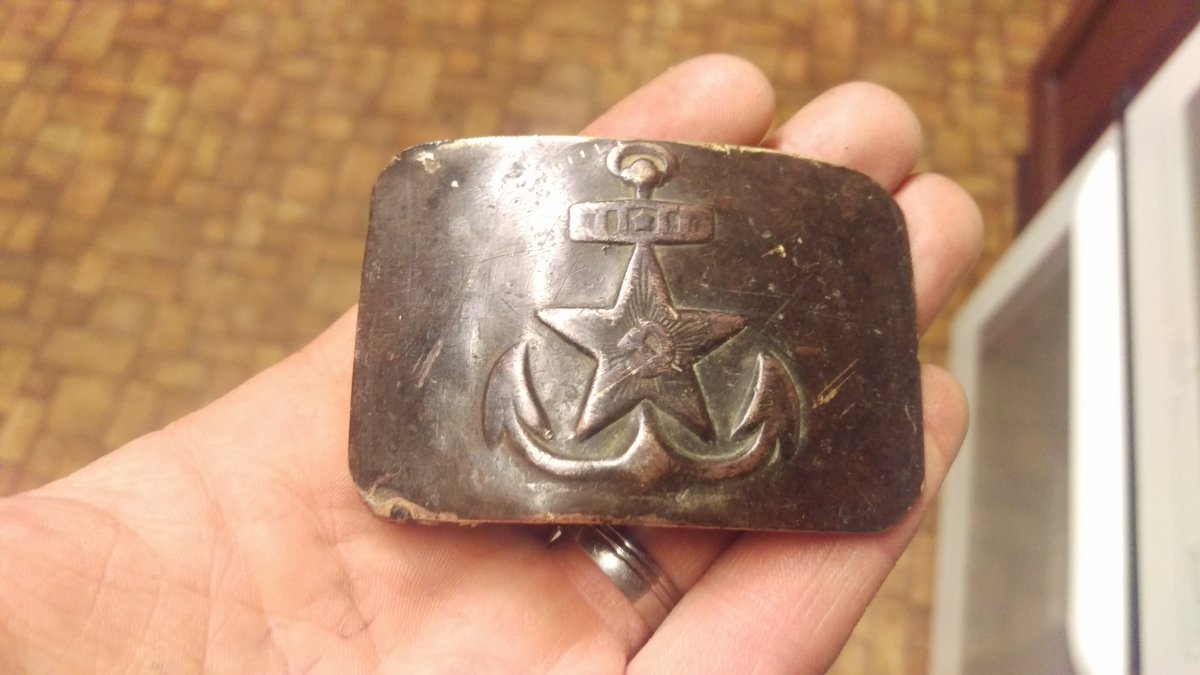 Пряжки состоящие из двух половинок вообще офицерские обычно, в советское время их носил вышкомсостав,в данном случае в простонародье она называется адмиральской, период с 50 по 70, я так пологаю, видел такого же типа с короной вместо звезды - это российского императорского флота вышкомсостав, и герб ссср на якоре на центральной вкладке - это более поздний вариант ссср, с уважением Sent from my HTC One X using Tapatalk