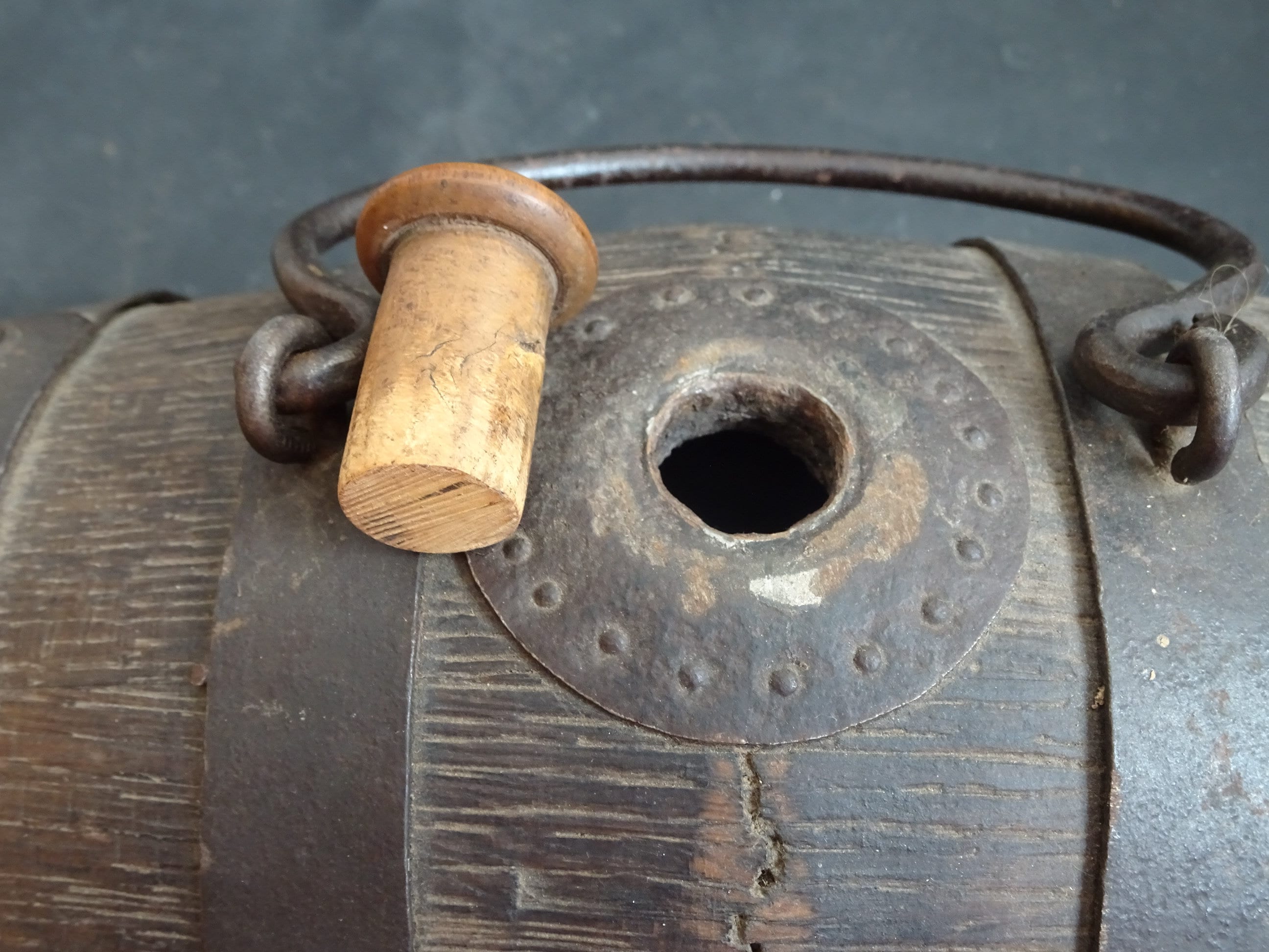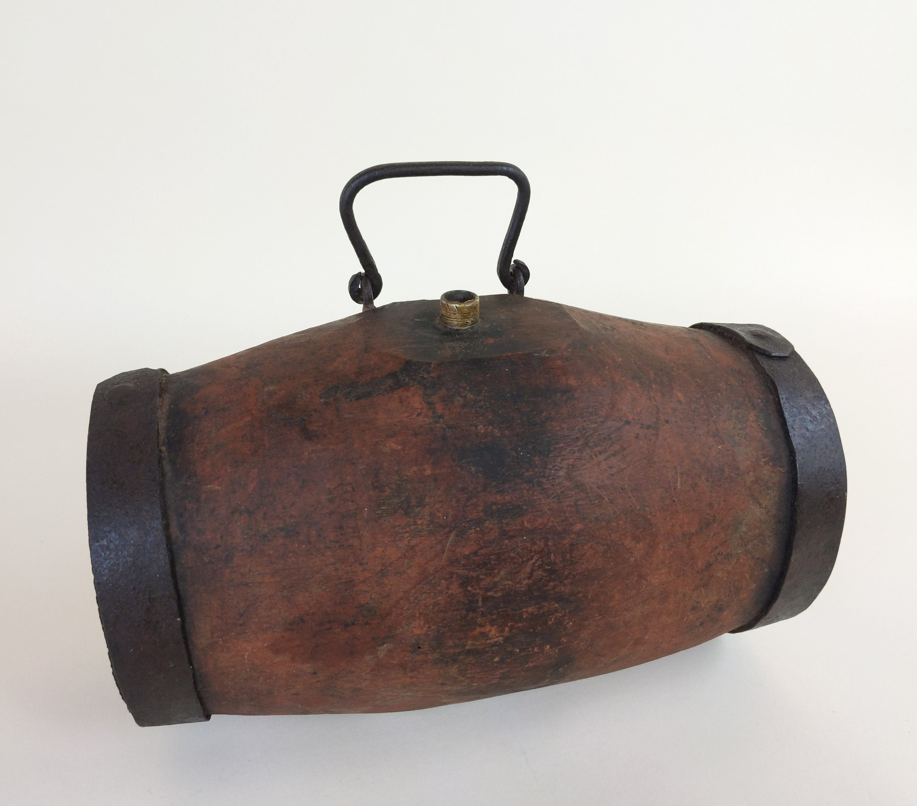 Мідний кег, судячи із матеріалу, припущу, що для димного пороха. Подібні використовувалися ще під час наполеонівських війн. Були також для води/ вина/віскі, але в основному дерев'яні або керамічні.