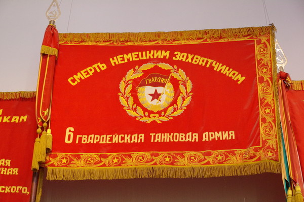 Оригинальные знамена 6-й гв. танковой армии до средины 90-х г.г. хранились в музее этой самой армии в Днепропетровске, откуда были выброшены на свалку вместе с огромным архивом фотографий бойцов и офицеров 6 ТА, грамот и писем самого Кравченко А.Г. и его однополчан (выбросили,якобы, в связи с ликвидацией или "переездом" музея). Несколько месяцев подряд бомжи, которые это добро подобрали на свалке, тягали по всему городу от скупки к скупке и фотографии, и знамена, и письма с грамотами, и прочее. Через время мне довелось держать в руках два знамени 6 гв. ТА врученные ей, кажется, в 60-70-е г.г. в связи с какими-то юбилейными датами от советских партийных органов Украины. Могу сказать, что оба знамени были выполнены из плотного материала с ворсой (бархат?), изображения Ленина и текст - вышиты нитками.