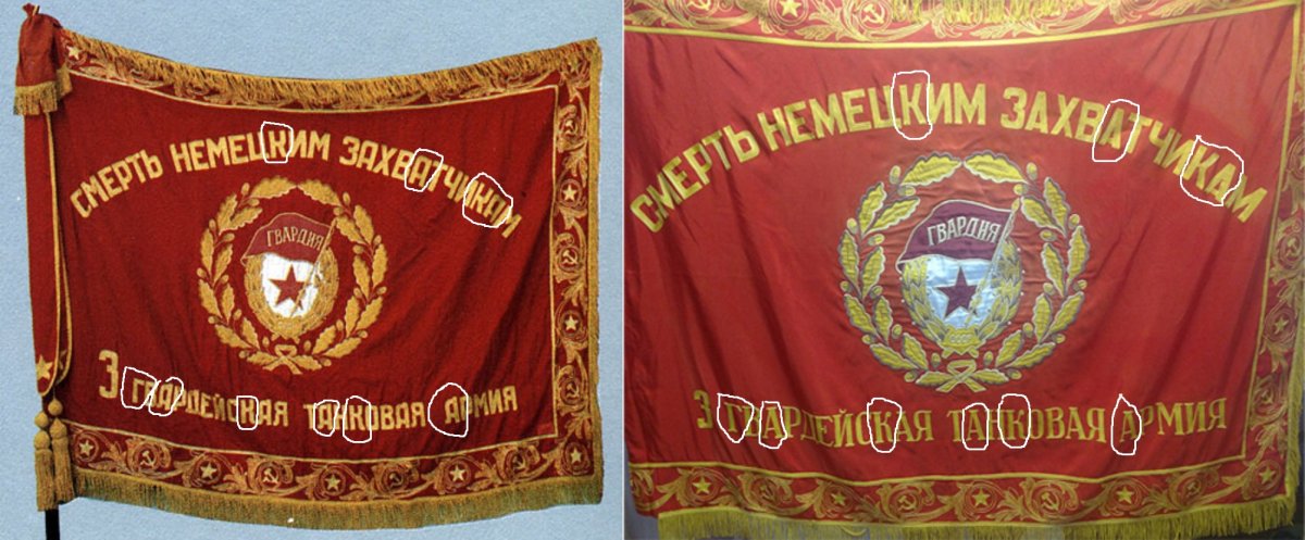 hfpyb разницы много и не точности. над дубовыми листьями посредине на стыке на первом стоит буква "И" на втором "М" В углу нижнем правом на первом знами над звездой виден листик там их два на втором только один цифра три с размерами шрифта проктически больше в два раза на втором меньше. последняя буква "М" в слове захватчикам на первом знамени видно растояние от контура больше на втором меньше.
