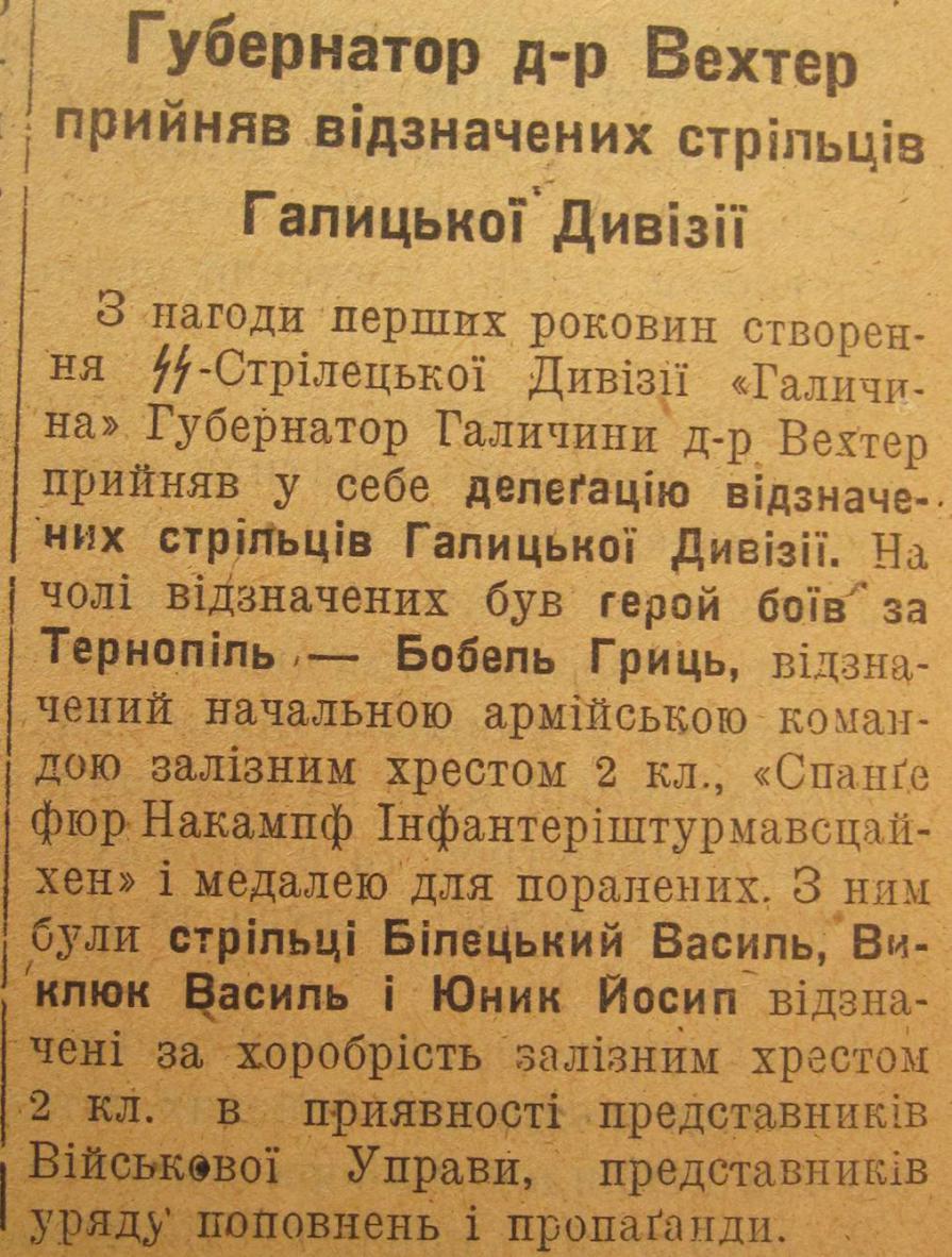 From 30th April until 10th May, the remnants of the Regiment were deployed under the command of 340. Infantry Division / 4th Panzer Army (HKGr.Sud) with some success. In April 1944, Governor Wachter accompanied by a reporter and photographer from the Divisional newspaper Do Peremohy visited one company of the 4th Regiment based in the Kaminka Strumilova district. Here he witnessed the bestowal of the Iron Cross 2nd Class on twenty four men, (twenty German and four Ukrainian), for their bravery in combat with Red Army troops in the area