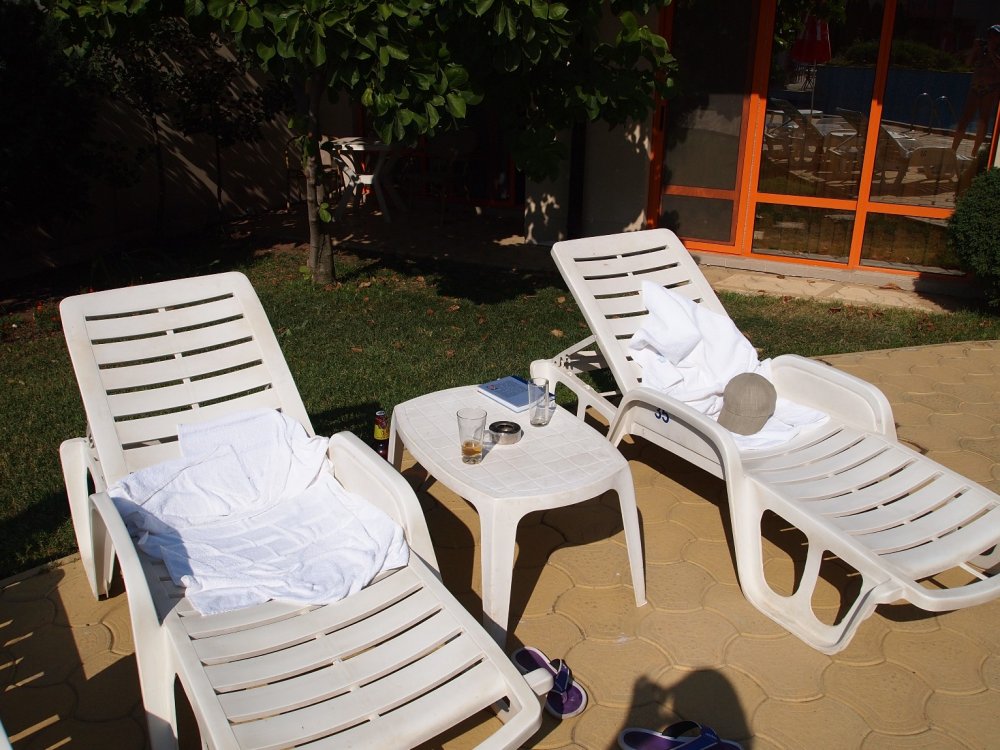 У нас был только завтрак. Да немного однообразно, но наедался нормально и есть выбор. Лежаков в принципе хватало. Был курьезный случай. Оставили два белых полотенца (гостиничных) на лежаках на ночь, утром одного нет... Пошли на рецепшен, чтобы предупредить. Девочка там так перепугалась, точнее думала, что наше полотенце украли. Когда выяснилось, что их белое полотенце махнула рукой и сказала отдыхайте спокойно. Была бы трагедия вселенского масштаба если ваша вещь пропала. Номер состоял из двух комнат, с выходом на бассейн. Росли деревья, постоянно была тень, стоял столик и стулья. Называли это место садочек. Я пошел в садочек...
