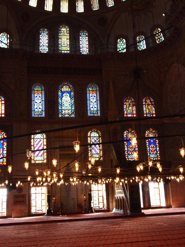 Кстати экскурсовод, всем нам, объяснил нам, что в связи с тем, что мечеть, действующая, да еще и музей одновременно, то у нее есть отдельный вход. Мы добрели до входа, где нас попросили снять обувь и положить ее в подготовленный для этого мешочек и закутали в большие голубые куски ткани, потому как наша одежда не соответствовала посещению столь набожного места. При входе можно было взять брошюрку, как утверждал гид про ислам и мечеть. Брошюрки были на различных языках. Я прихватил две, как оказалось назывались «Что такое ислам», где описывалась какая хорошая религия... У выхода на стене висела, как нам показалось картина. Но мы ошибались – это была одна из страниц древнейшего Корана, а рядом под стеклянным куполом находился макет Голубой мечети расположенной в Мекке.
