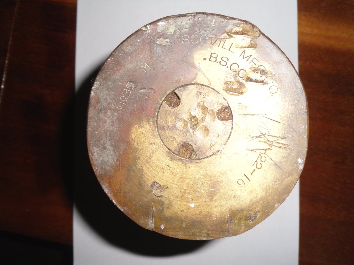 Однозначно с росс трехдюймовки 76,2 мм царского заказа. У меня тоже есть подобная американка, 1916 года выпуска. Тоже набита литера "М". Но переснаряжена в 1942 года ( капсюльная втулка 1942 года), а найдена вообще на месте боя в феврале 1943 года.