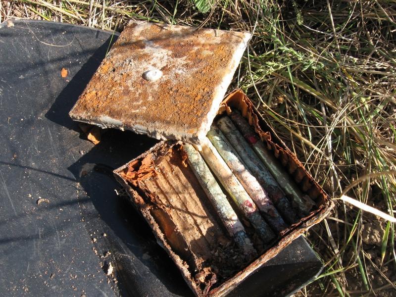Жаль фото пропало вместе с виндой... А история моего облома такова - под поваленным деревом,совершенно так на всякий случай сунув туда корсара,получаю такой себе бодрый сигнал. Исхитрилась под этим стволом углубиться см.на 50 и открылся взорам цинк!целехонький! А в нем... гильзы моськины. Цинк лежал вверх дном (зачем спрашивается???)