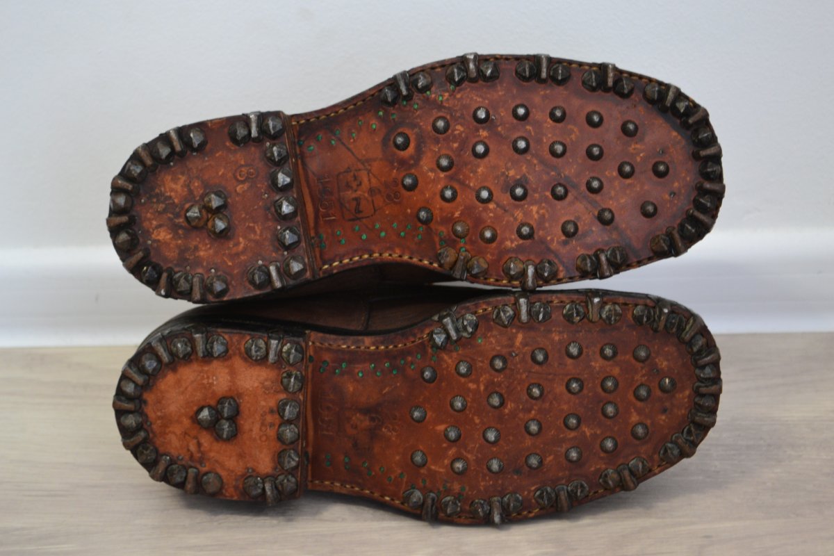 Производитель: Karl Jordanag/Britthau. Размер: 28 (наш - 43р). Размер стельки: 280 мм. Год выпуска: 1951. Состояние ботинок как новые. Коричневая кожа. Кожа мягкая, крепкие, можно юзать по назначению. Все шипы на месте. На рекон супер. Внутри и снаружи ботинок имеются маркировки. Отправлю НП по Украине. Цена вопроса: 1200 грн + дорога.