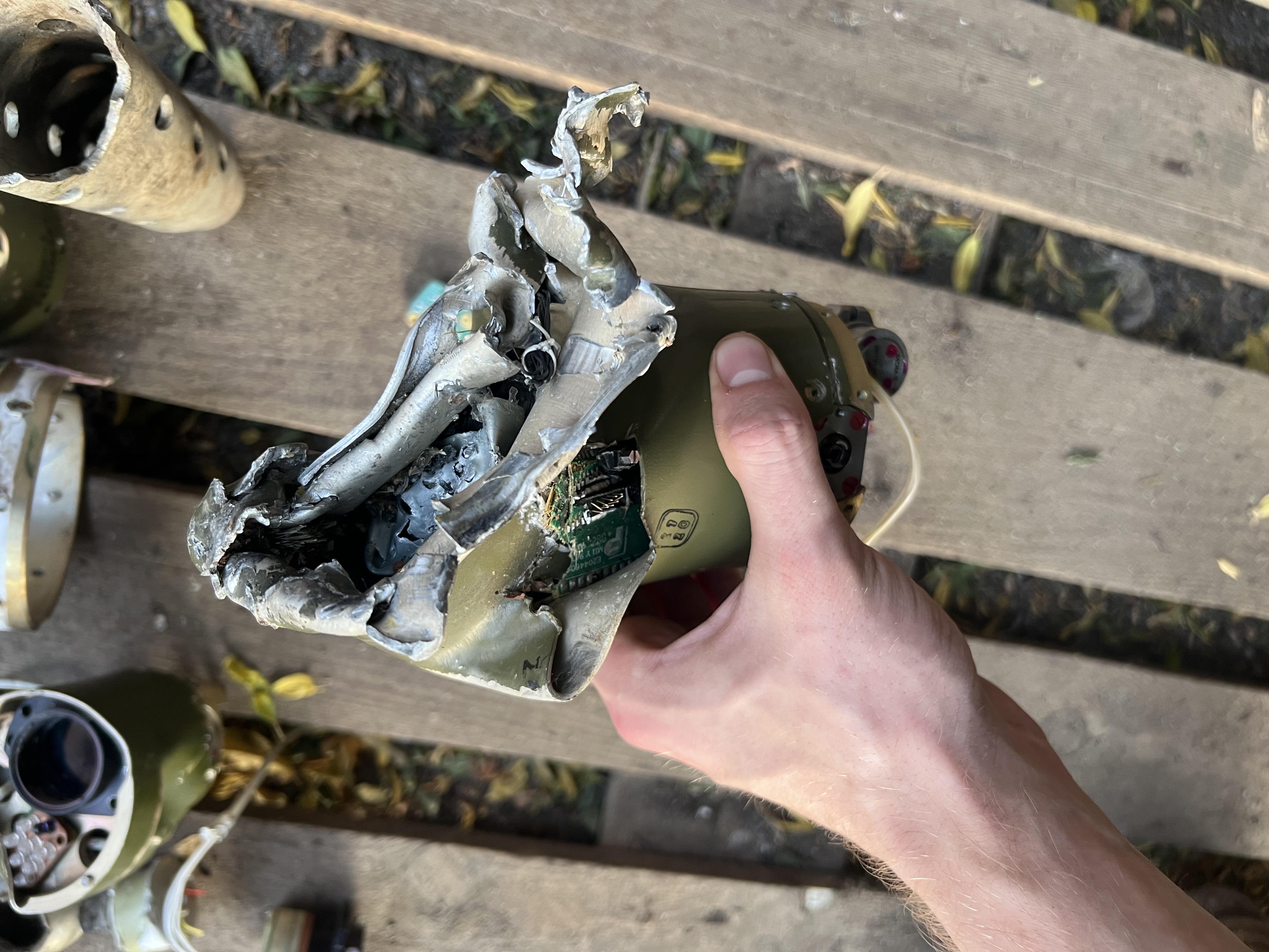Вітаю. Мені бачаться залишки ПТУРа Корсар. Діаметр деталі на фото2 повинен бути 107мм без деформації.