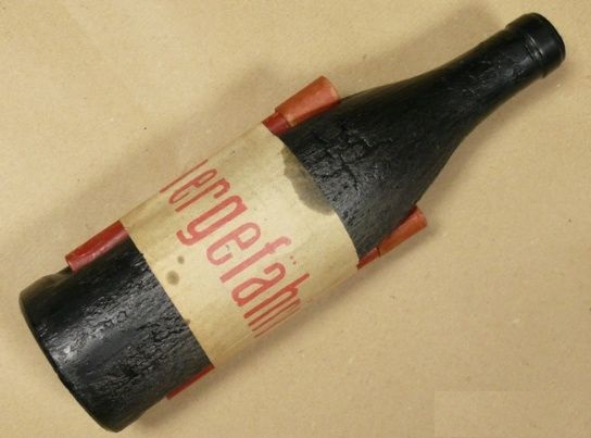 Хотелось бы добавить: Brandflasche представляет собой специально изготовленную бутылку из темно-зеленого стекла с двумя углублениями для воспламенителей по бокам. Воспламенители крепились к бутылке бумажной лентой с красной надписью "Feuergefährlich"(Огнеопасно) Размеры бутылки: высота 25см, диаметр 6см. Наполнялась горючей смесью Flammöl Nr.19 от огнеметов и бензином в соотношении один к трем. В 2018 году продалась за 600 грн. : https://reibert.info/lots/nemeckiy-kokteyl-molotova-brandflasche.263214 В 2021 году были проходы по 700грн. : https://reibert.info/lots/nemeckaja...telnoj-smesi-brandflasche-vysota-26sm.654490/ https://reibert.info/lots/nemeckaja-butylka-iz-pod-zazhigatelnoj-smesi-b.659974/ Сейчас вопрос...