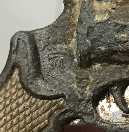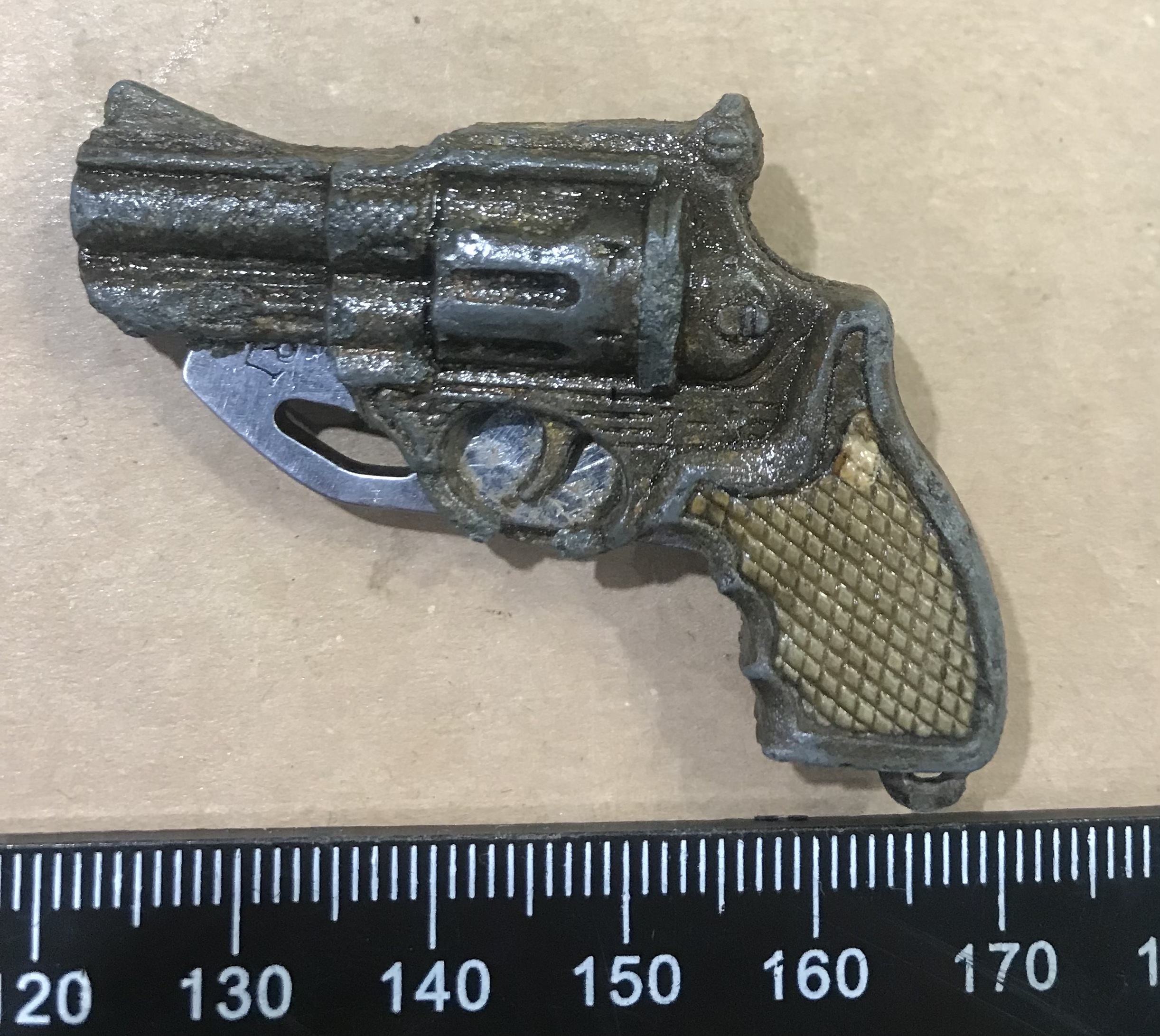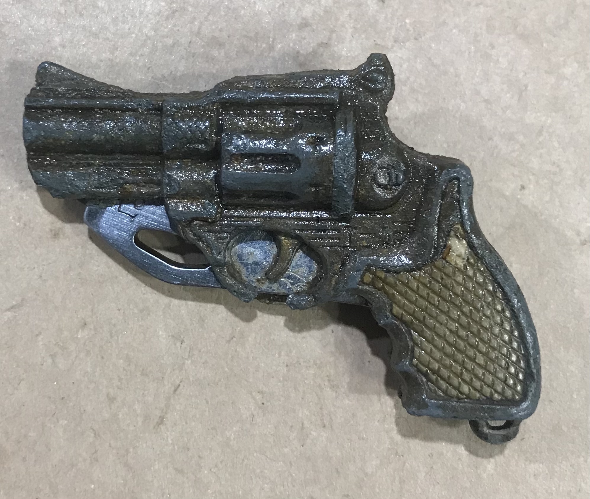 Всім доброго дня Ще влітку на німецьких позиціях відкопалась така цікава штука(нарешті дійшли руки пофоткати ), схоже на брелок з відкривачем у формі револьвера. Проглядається клеймо у формі корони , і ще є одне клеймо на відкривачці. Судячи із стану цинку лежало в землі явно не 20 років , думаю скоріш за все брелок ще з тих часів , може хтось бачив щось подібне