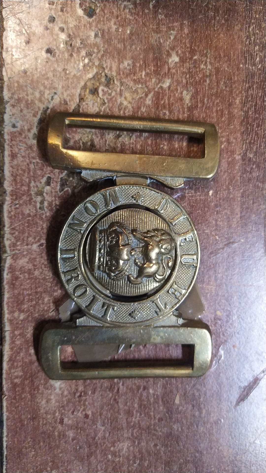 Наскільки мені пояснили, і підтвердження дає Гугл це армійська пряжка. Сучасна так виглядає. Це Елизавета Друга 1952-2022 роки тип пряги. В мене корона іншої епохи і інший лев.