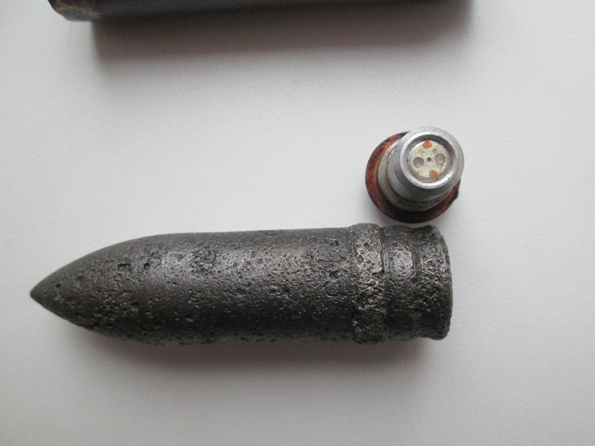 Здравствуйте уважаемые,прошу Вас помочь мне в определении данного снаряда. Калибр примерно 20мм+-. Как видите отстрел,насколько может быть опасен? и от какого вида арт установки? С Уважением..