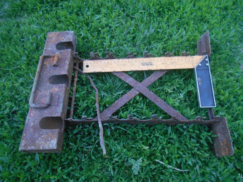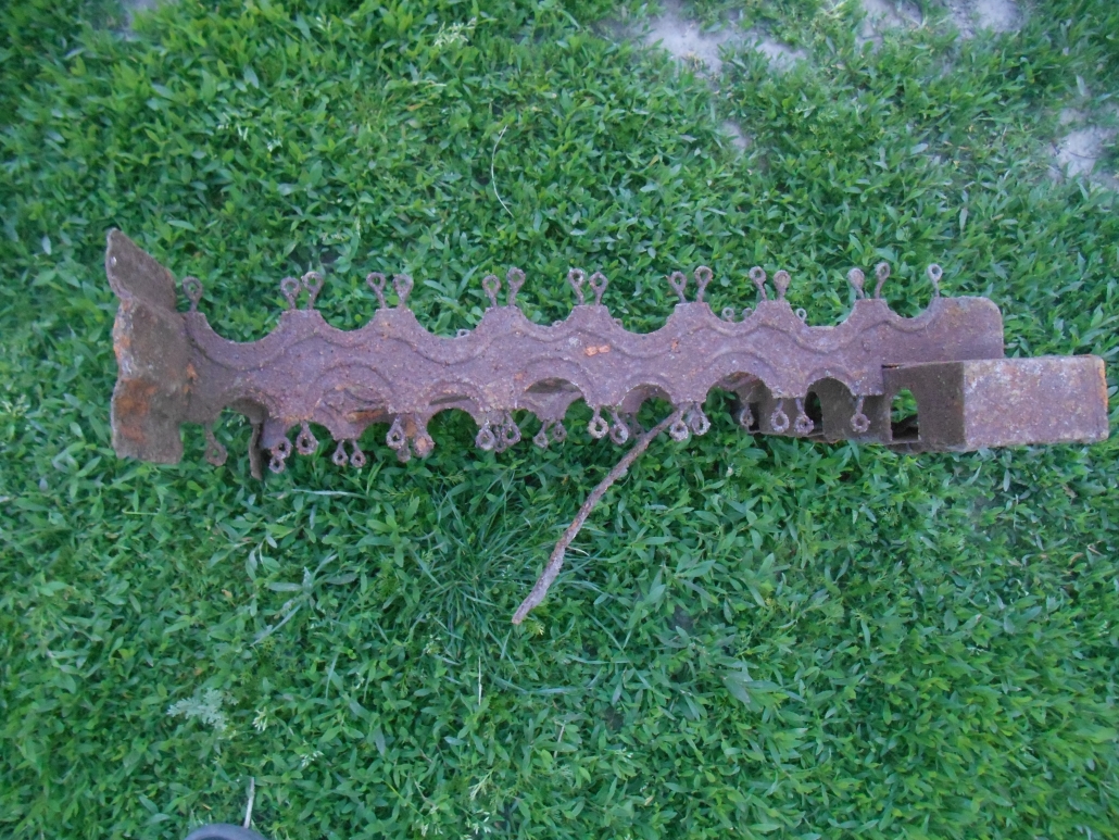 Броня ___ окрашена жовтою краскою і червоним грунтом. Товщина орієнтовно 35мм. висота 850мм, ширина до центру 1000мм. Має ребра товщина орієнтовно до 15мм , по середині нито приципне нио щось інше. Побоках середньої деталі два відбійника діаметром близько 100мм і тієюж висотою(має форму стакана в якому розміщена резина і на торці якої кріпиться кругла пластина товщиною 10мм.