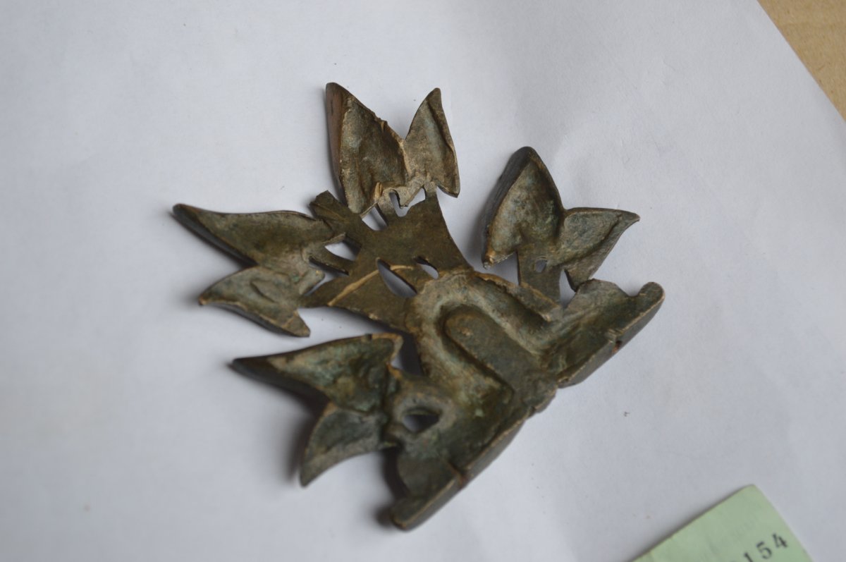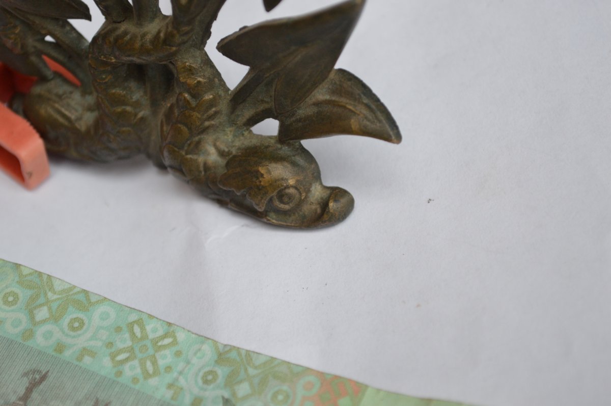 Доброго. С древнейших времен и по сегодня дельфинов никогда не изображали с чешуей, это раз. Второе: обработка напильником в античное время не слишком известна. Третье: абстрактный символизм не был присущ ни одной из древних культур, это с эпохи Возрождения пошло. Наконец - отверстия крепежных шпилек слишком "хилые", диаметр вряд-ли превышает 2 мм. Для древности не характерно, т.к. столь прочных материалов просто не существовало, это уже с периода мануфактурного и фабричного пр-ва разрабатываются технологии получения спецсплавов и их термообработки для получения прочных и относительно небольших изделий. Вывод - предмет, представленный ТС, литая декоративная накладка, обработаная с торца грубым напильником, явно предназначенная для установки на твердый и неподвижный предмет - нар. мебель или подобные штуки (шкатулки, письменные наборы и т.п.). По времени думаю втор. пол. ХІХ в.-20-е гг. ХХ в.