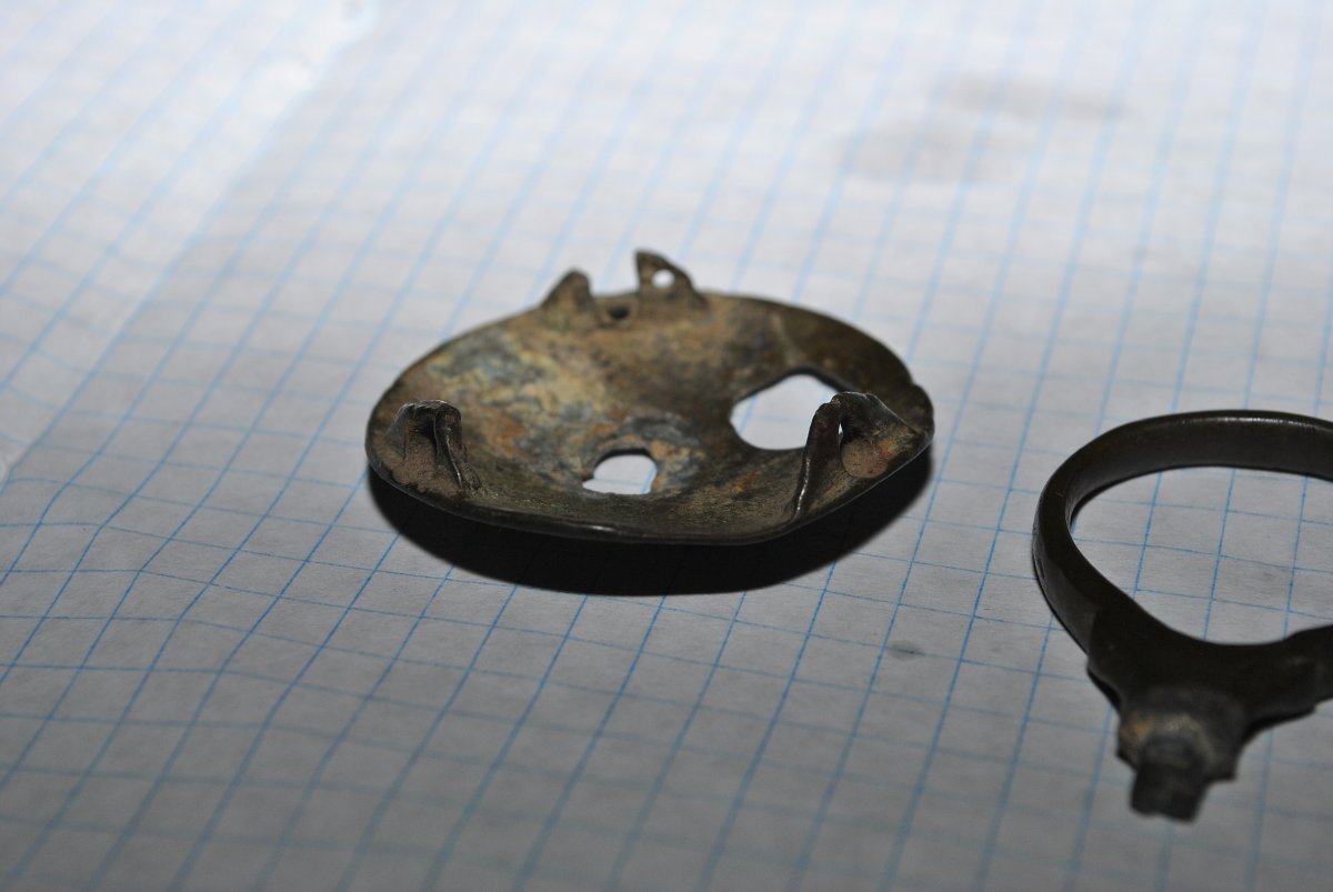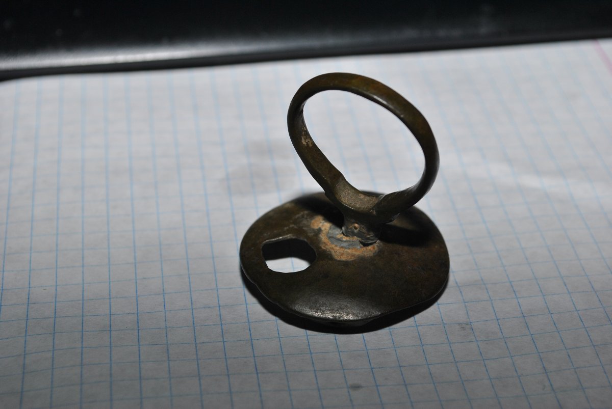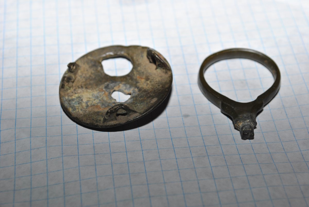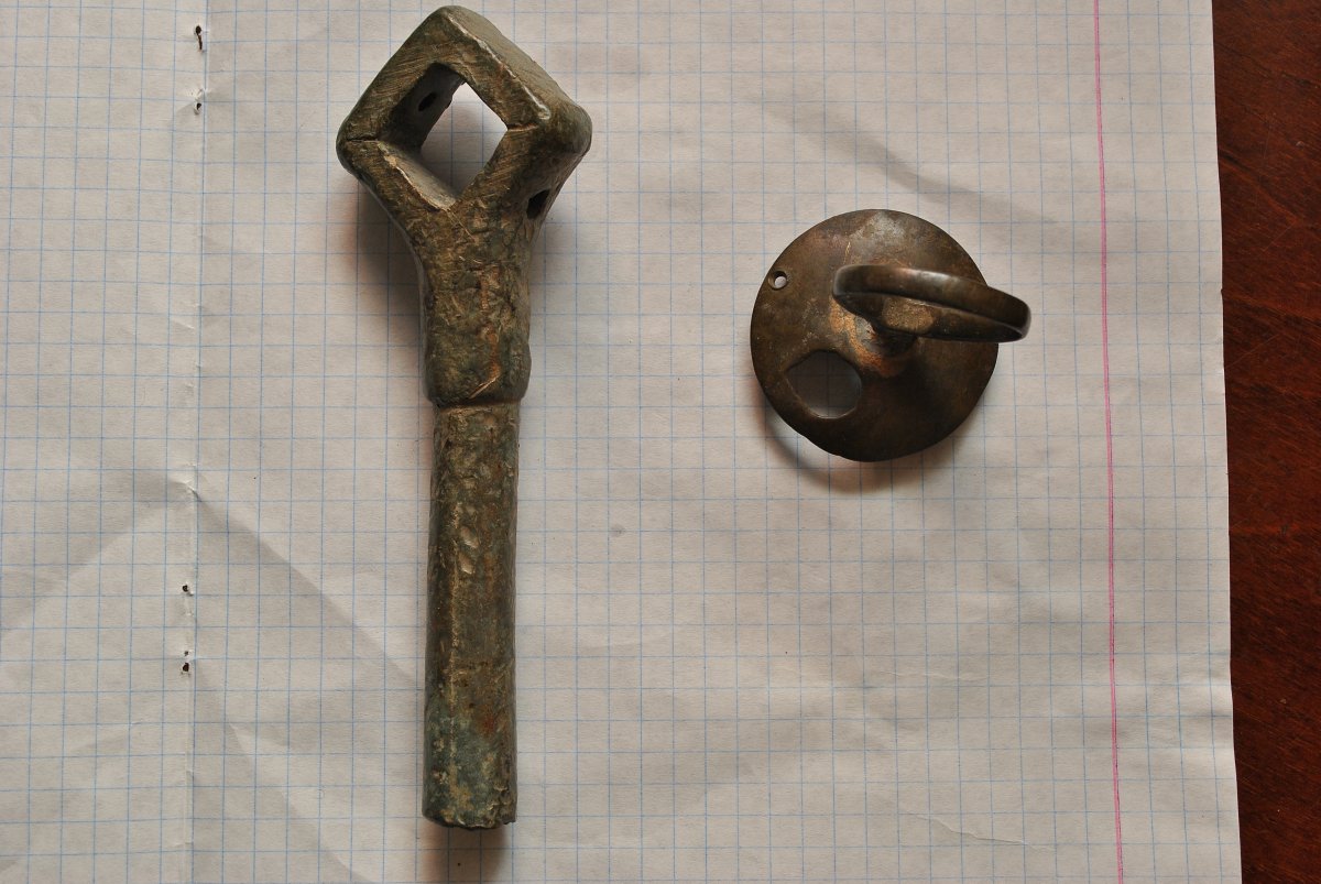 Здравствуйте. Ломаю голову что это я выкопал неделю назад. Сопутка монеты начиная с Елизаветы. Штука похожая на ключ была в одной яме, а крышечка с кольцом в другой.