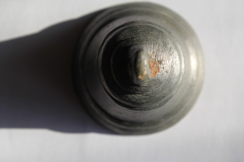 Здравствуйте,уважаемые форумчане! Прошу вашей помощи в идентифицировании данного колокольчика.На нем видна мелкая царапина где чётко видно что сплав бронза(жёлтый цвет метала)Может и золото=)Но оно ж не окисляется.Также видна патина начинающая,но правда серого оттенка схожа на олово.Может это оловянистая-бронза?Сам колокольчик рабочий.Жаль нельзя передать самого звука его.Он очень уж больно звонкий и звенит сам цилиндр-мягко и продолжительно затягивает.Язычок с черного метала(конусной формы).Видна ручная работа,стенки цилиндра колокольчика в среднем от 2.5 мм.Высота от языка к ушку-62 мм.Самого цилиндра -51 мм.Диаметр внизу-50мм.В верху диаметр-31мм.Изнутри видна чешуйчатое литье сплава.Вес-109.2 гр
