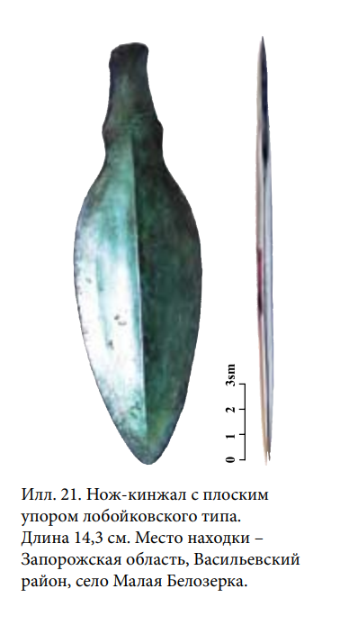 Здравия! Похож на нож - кинжал с плоским упором лобойковского типа, позднего периода бронзового века (1700 - 900 г. до н.э.) Срубная культура. ИМХО.