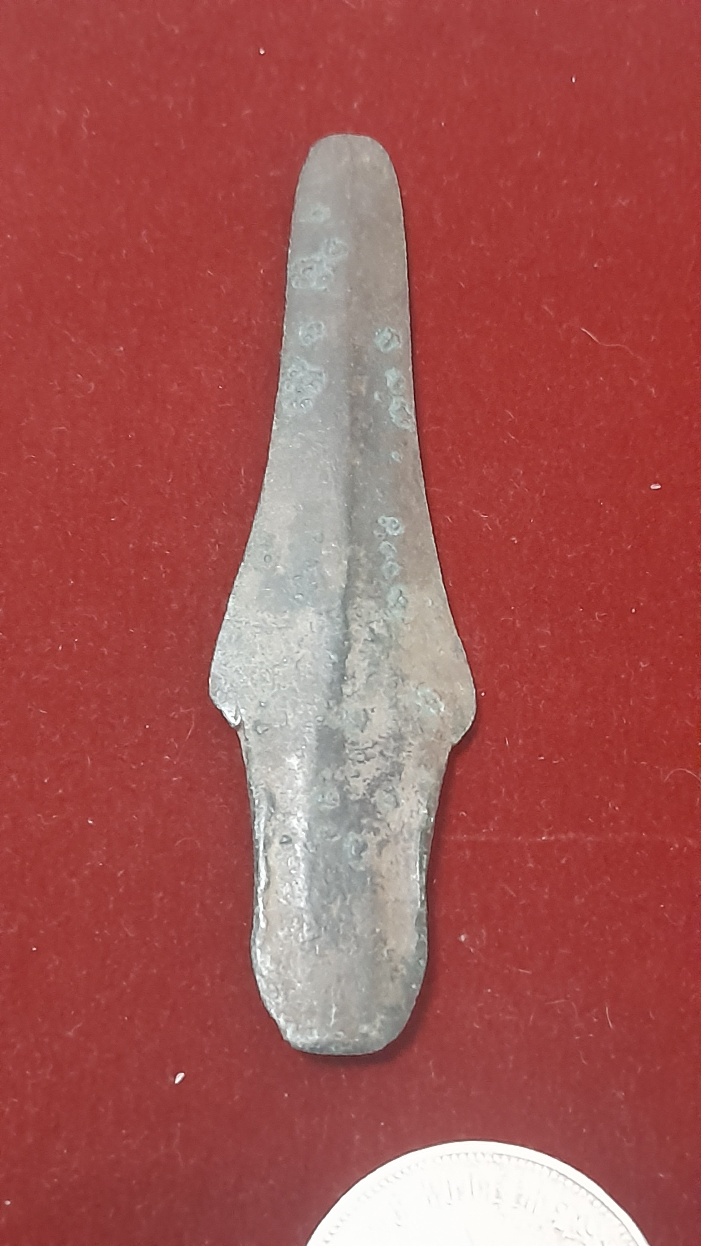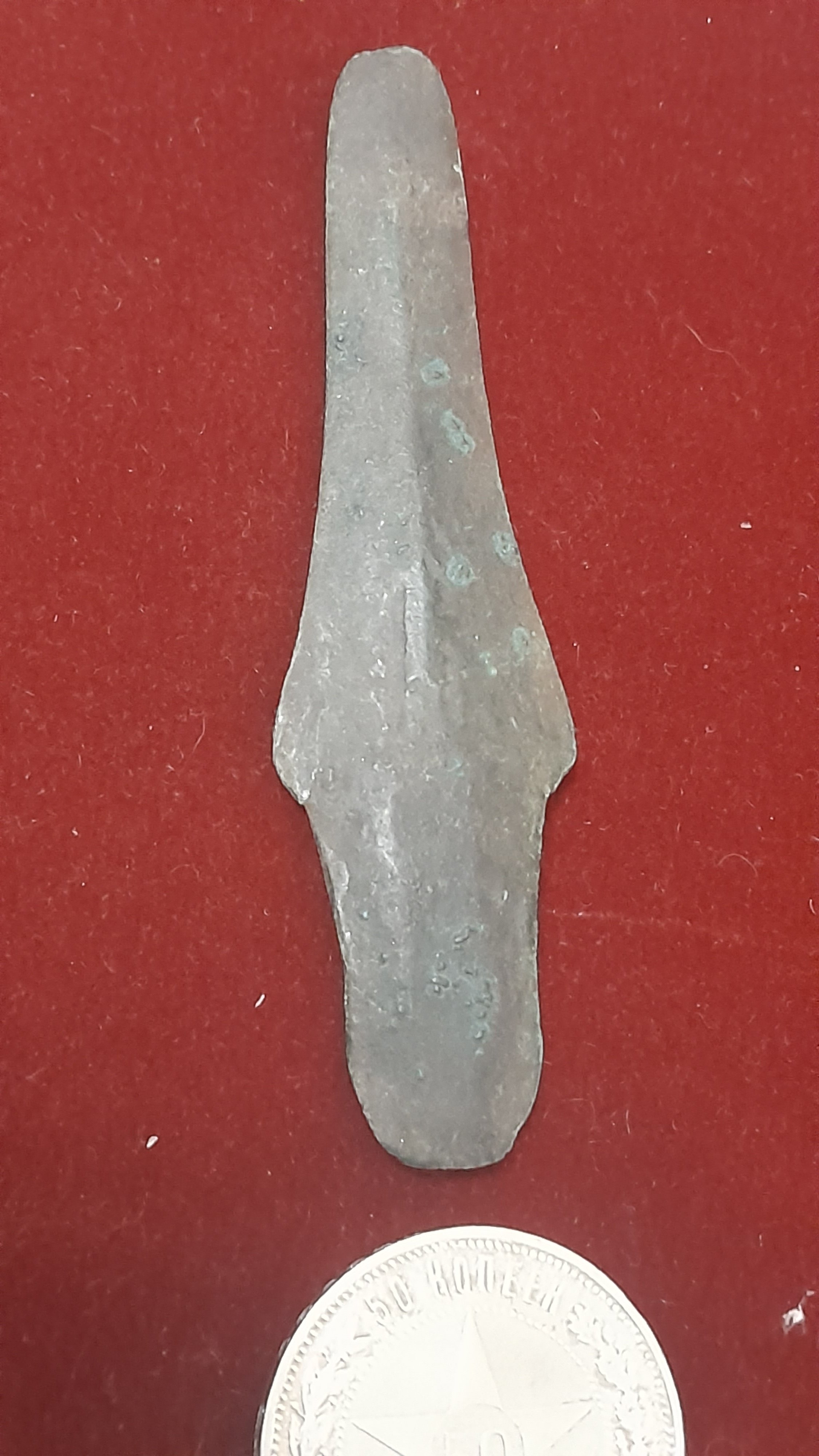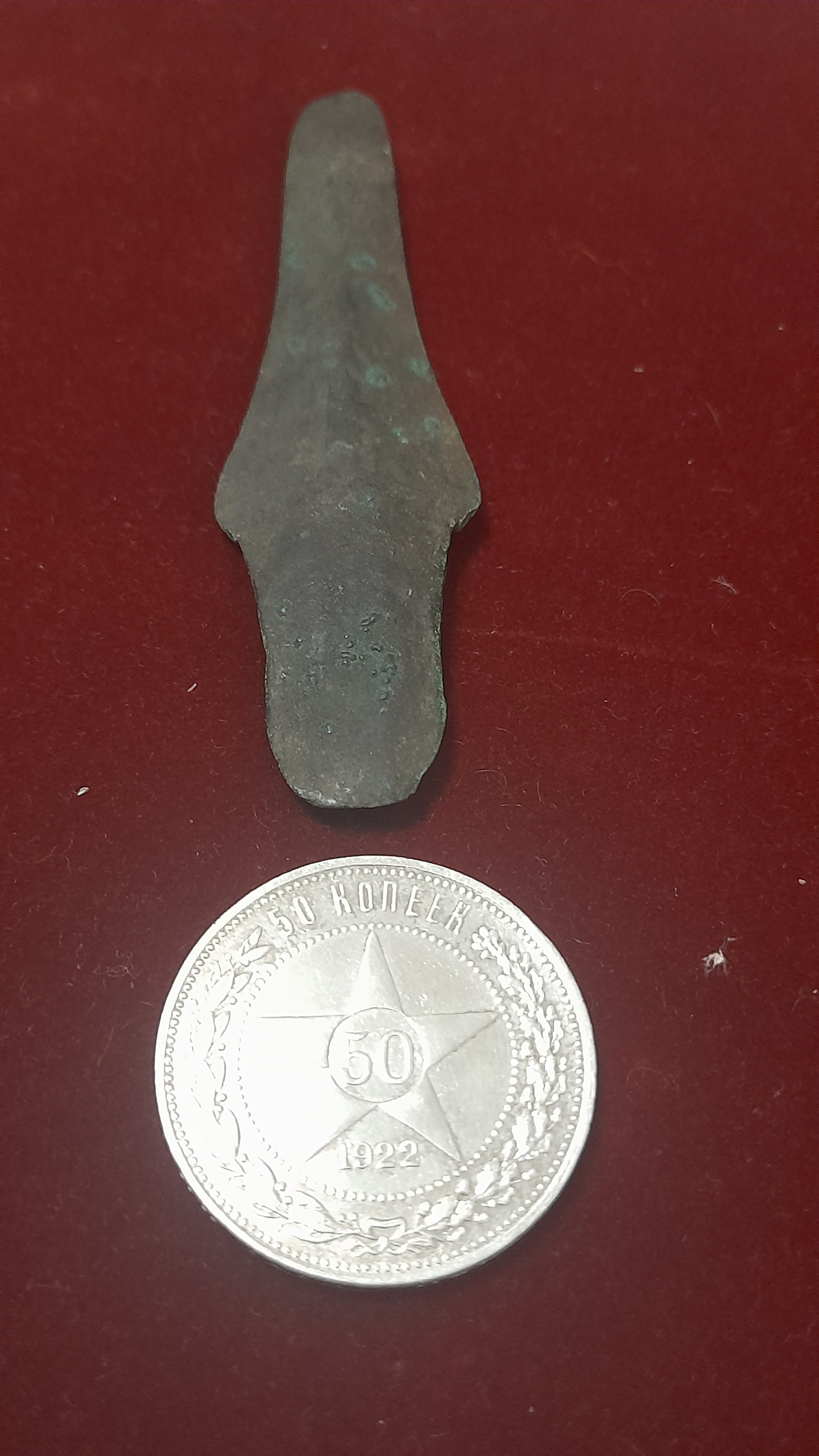 Вітаю, поздняя бронза, имхо. Для атрибуции таких девайсов желательно указывать регион, фото выставлять миниатюрами, с линейкой вместо монеты...если, конечно, полташ не в одной ямке лежал.