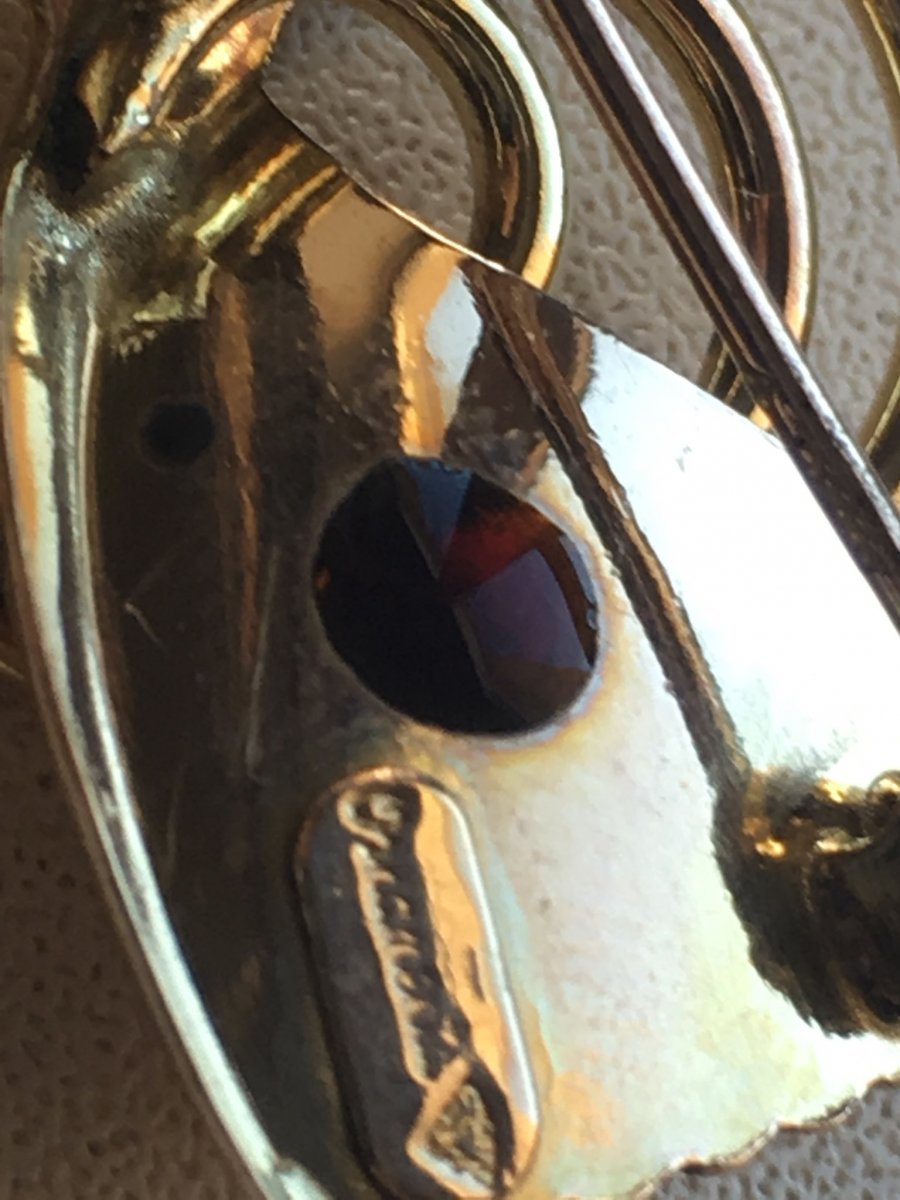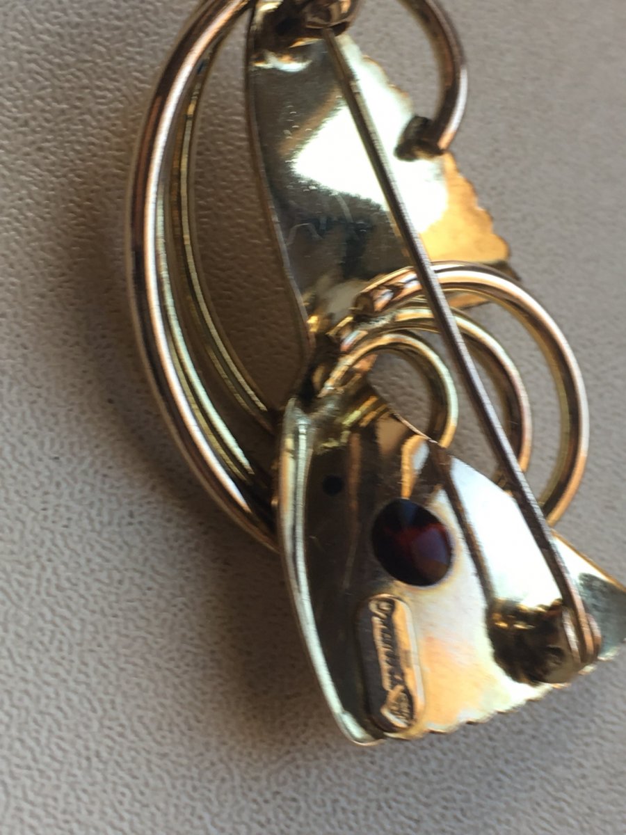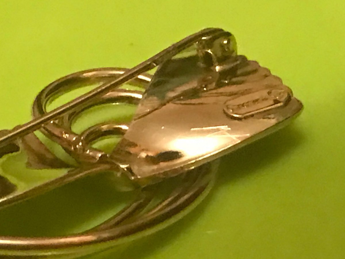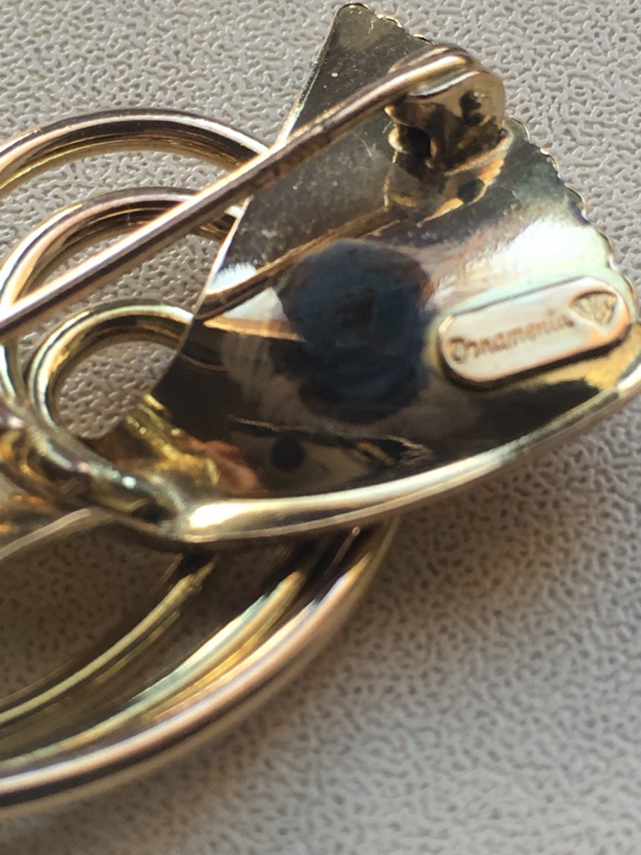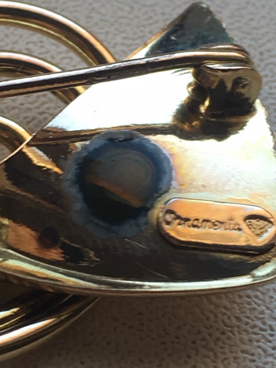 Подскажите пожалуйста по брошке,вес 7 грам желтого цвета,на иголке стоит проба, немного вытерта 375, или 379, еще есть надпись (возможно на итальянском) "ornamenta" и какое-то клеймо но на фото не получается заснять. Капнул йодом реакция йод не светлеет,после высыхания остается черное пятно.Подскажите пожалуйста что за брошка и каких годов? Заранее спасибо.