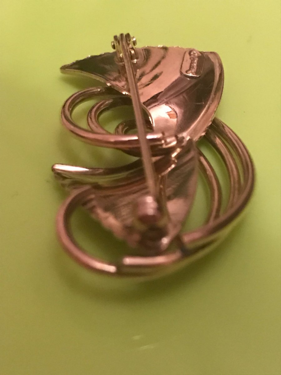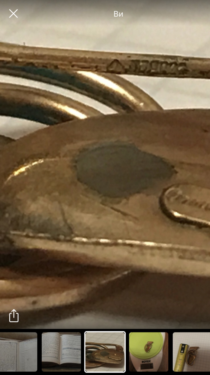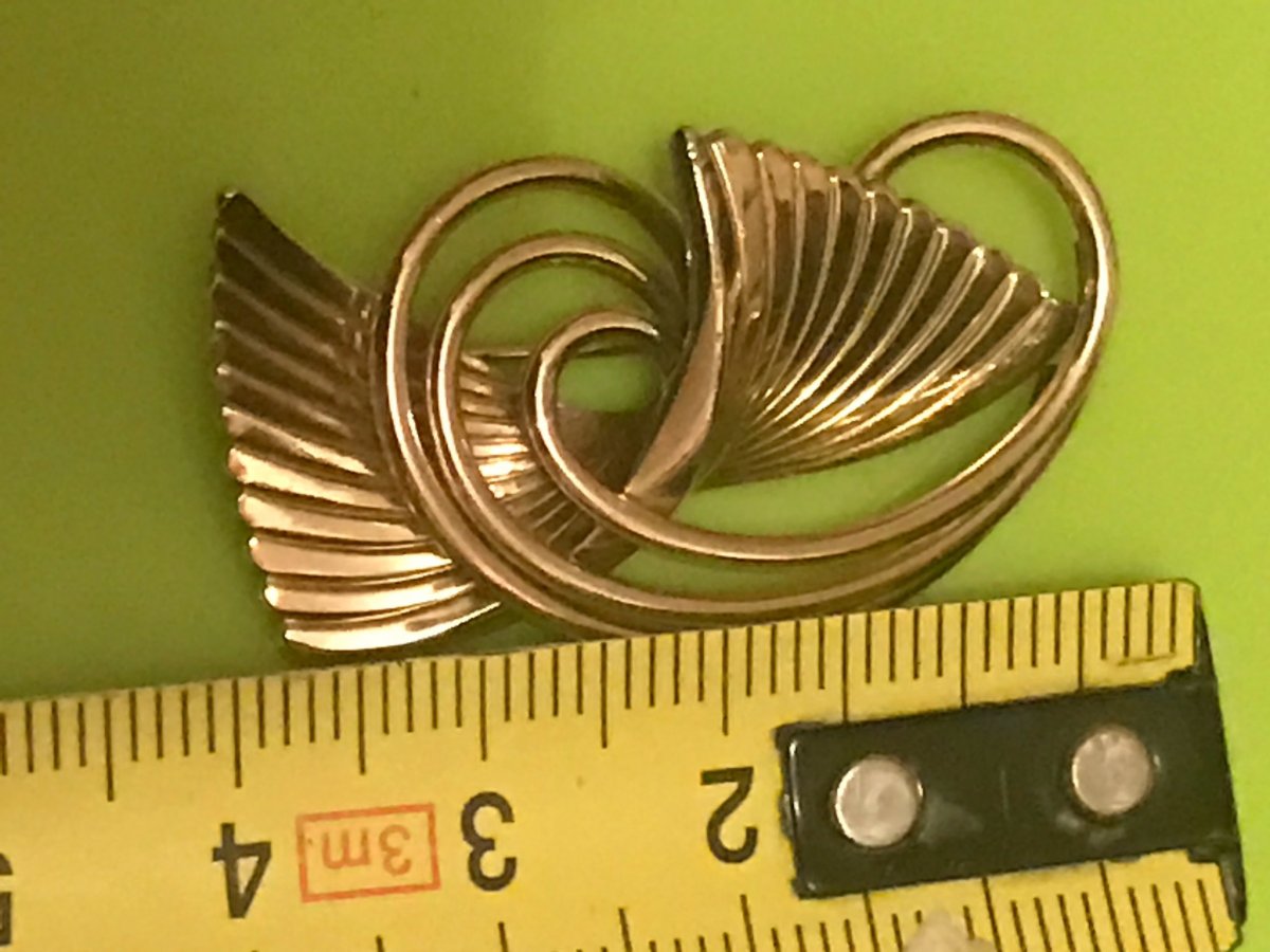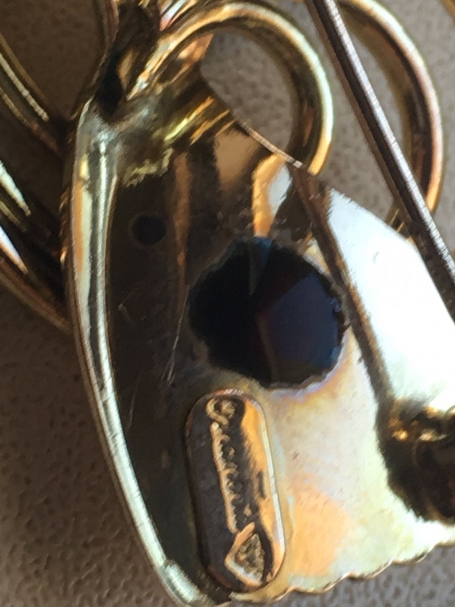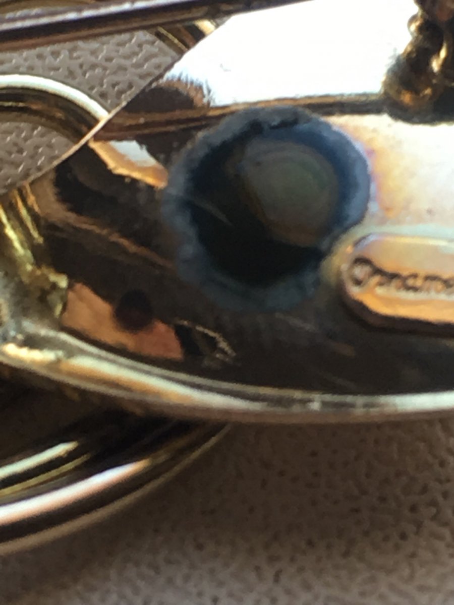 Подскажите пожалуйста по брошке,вес 7 грам желтого цвета,на иголке стоит проба, немного вытерта 375, или 379, еще есть надпись (возможно на итальянском) "ornamenta" и какое-то клеймо но на фото не получается заснять. Капнул йодом реакция йод не светлеет,после высыхания остается черное пятно.Подскажите пожалуйста что за брошка и каких годов? Заранее спасибо.