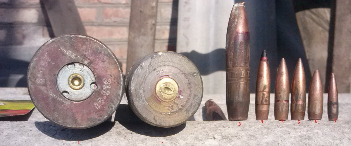 №1 ГИЛЬЗА 30х165(бмп-2 или БТР-3/4). №2 гильза 23Х152В(Шилка или ЗУ-23) №№3,4 пули патрона 12.7Х108 вроде обе Б-32,мне остатки краски плохо видно,могут быть и БЗТ. №5 Б-32 патрона 7.62Х54R №№ 6-10 ЛПС разных годов выпуска патрона 7.62Х54R,как вариант если в жопе свинец то СН №11 ПС патрон 7.62Х39 №12 ПС(или ПП) патрона 5.45Х39 №13 порванная ЛПС