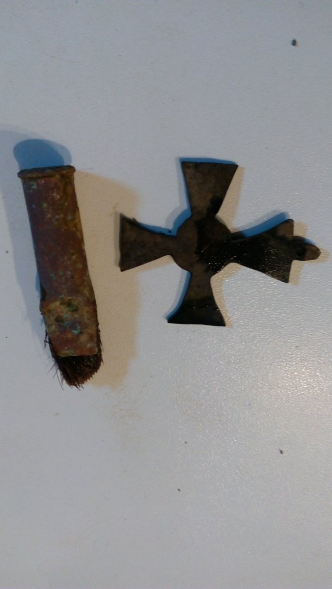 Вчера попались два експонати на музей. Пензлик з гільзи та заготовка на саморобний хрест. Хтось пробував "Георгія" собі на дембель ізваяти.