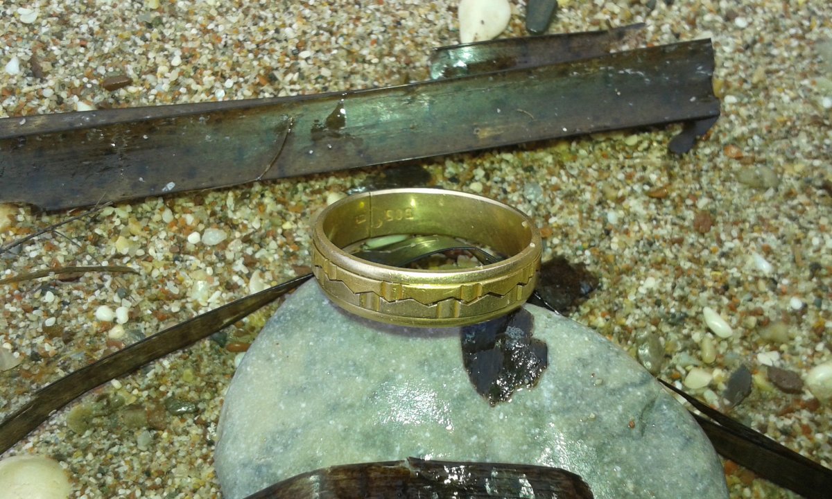 Штормило, була злива на наступний ранок я пішов на пляж. Весь пляж просто встелений алюмінієвими язичками від напоїв, але місцевий надибав золоте кольцо поглядом без МД - мій апарат показав на нього віді 20-24 - 100% алюмінієвий сигнал які я після 20 пивного язичка перестав копати. Підняв трохи срібла, кільце і підвіска , на кільці гравірування , якщо найдеться власник - поверну думаю для нього воно цінне як символ. Із цікавого албанські леки та югославський 1 динар, зараз в Сербії такіж самі в обігу тільки герб на них інший тай напис не Югославія а Сербія