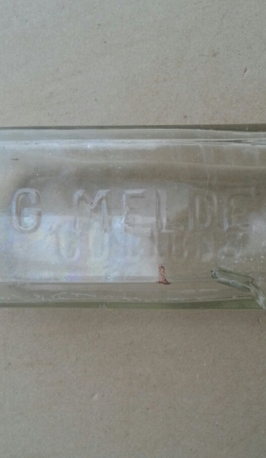Вітаю! Пляшка з-під чогось алкогольного: коньяк, лікер. Тут є інформація про це старовинне підприємство https://de.m.wikipedia.org/wiki/Kornbrennerei_G._Melde