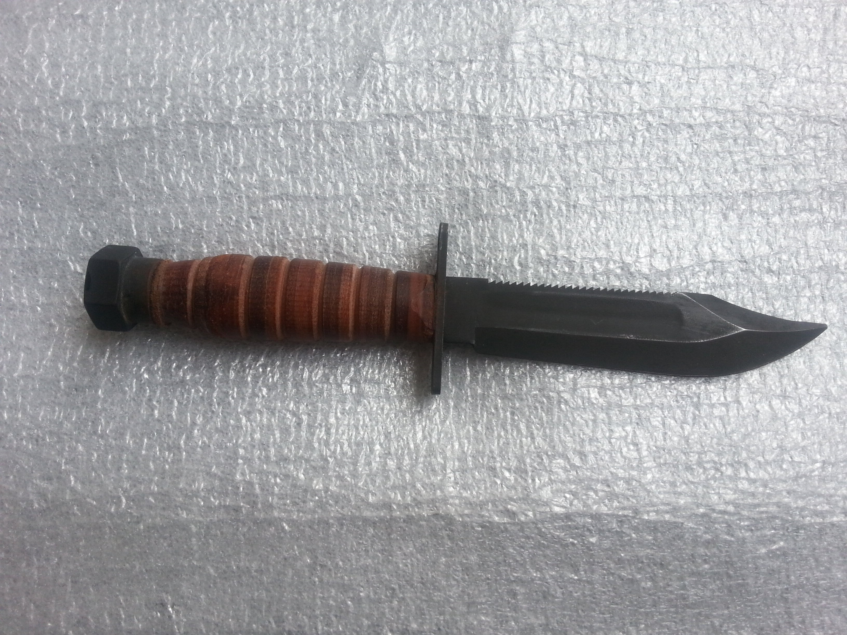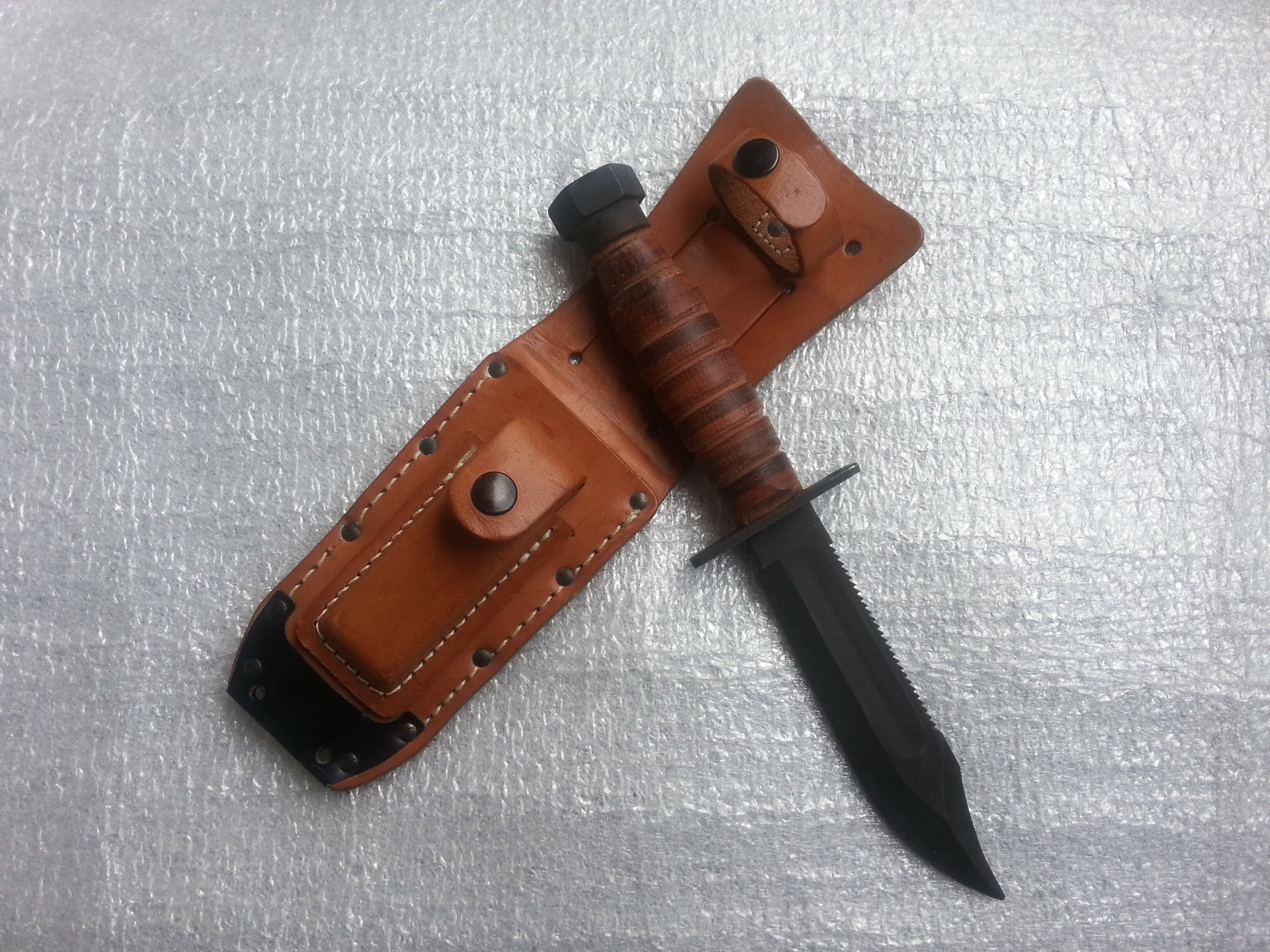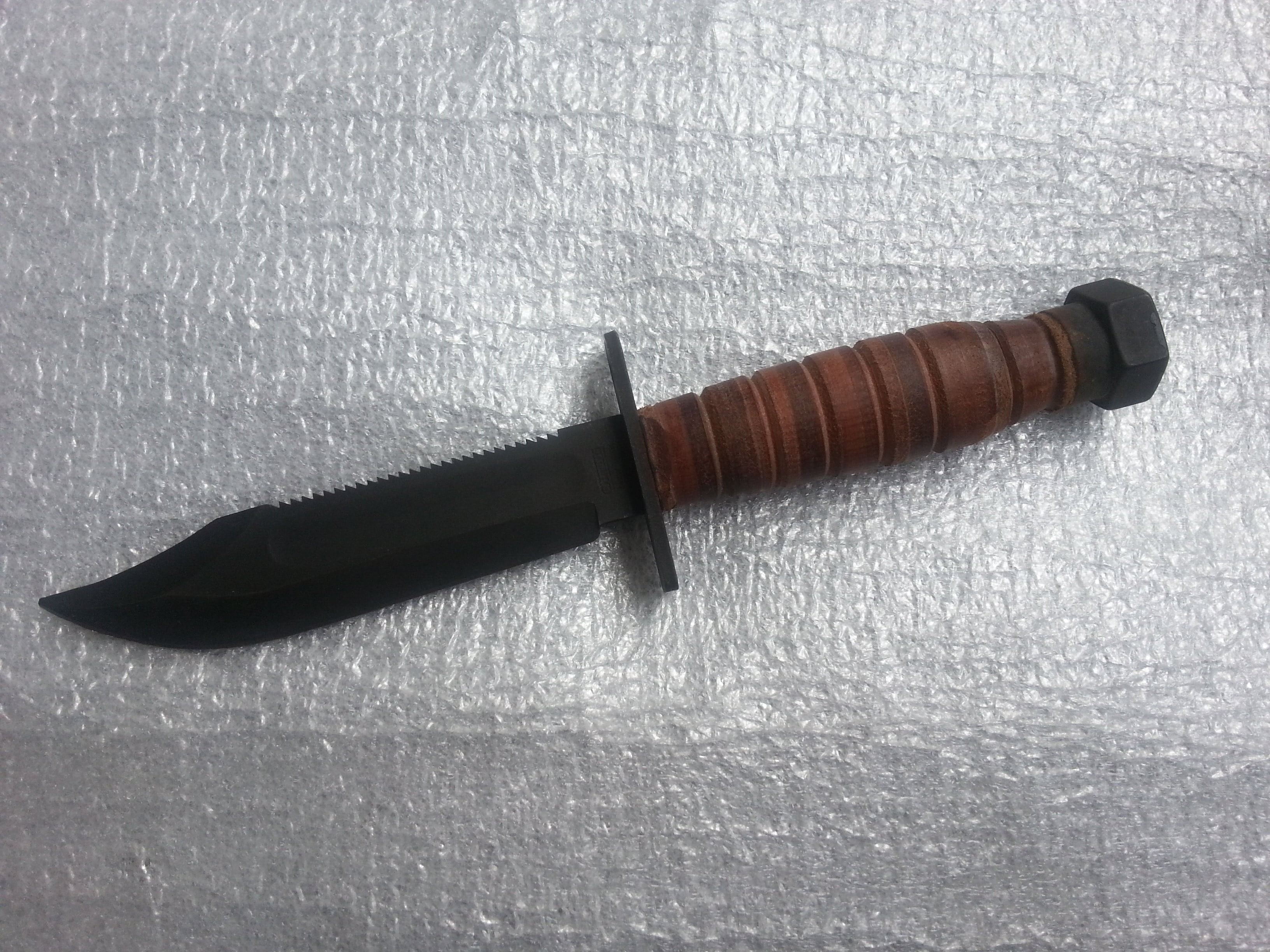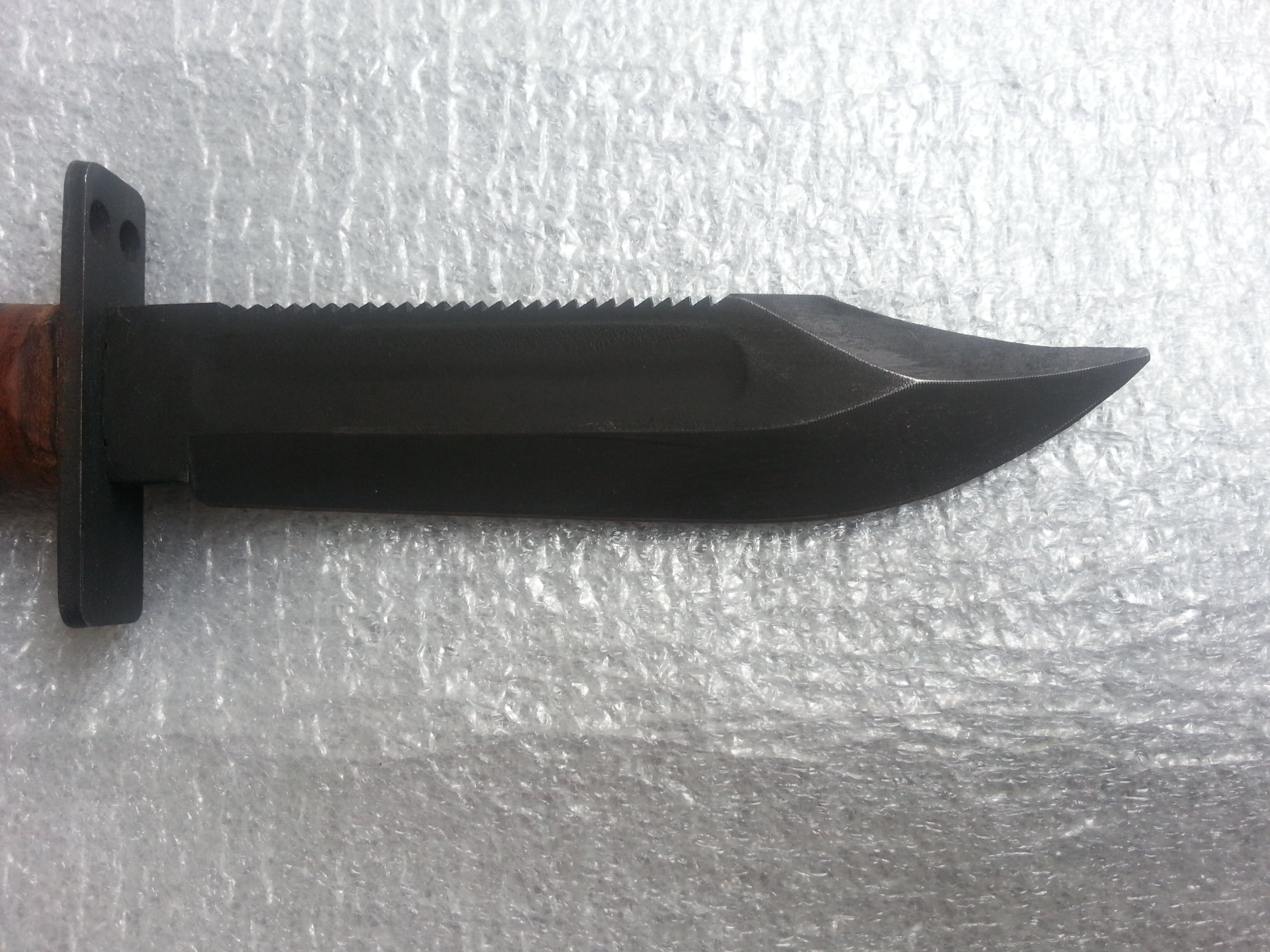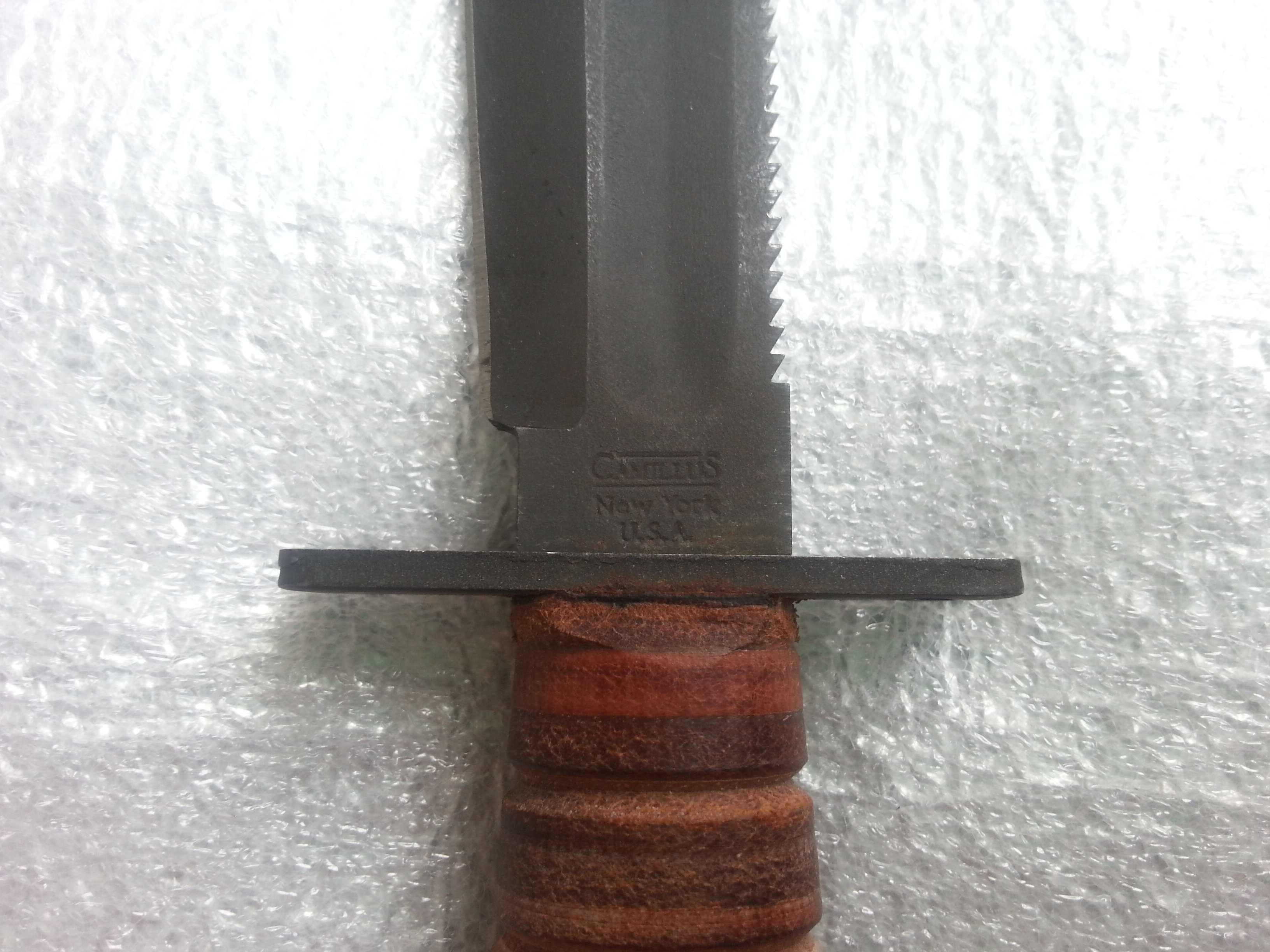 Ось такий Camillus New Yor U.S.A. Довжина клинка довша за Ontario на 10мм і становить 137 мм. Загальна довжина 251,3 мм. Твощина клинка 4,9мм. На потиличнику клейм та дати немає, пофарбований чорною фарбою. Клейма тільки на клинку в три рядки Camillus New York U.S.A. На камінці для заточування маркувань немає. Комерційний? Випуск після 1974 року? З повагою