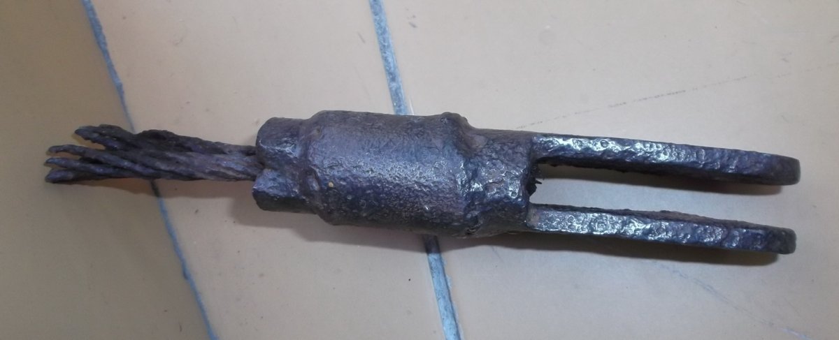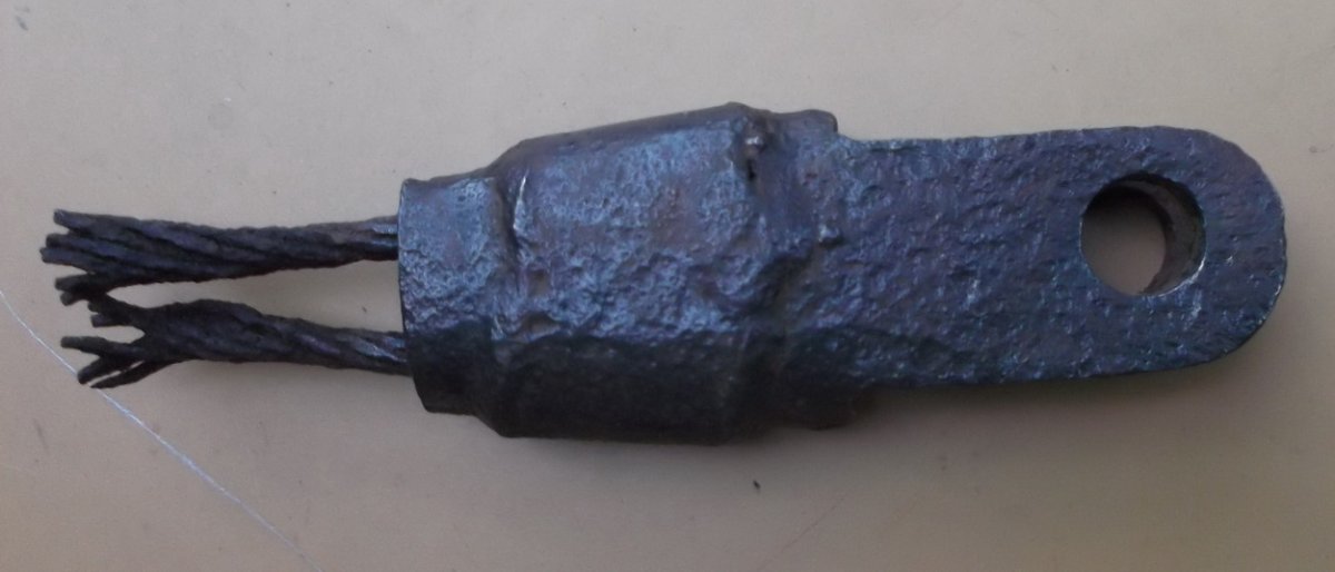 Поддерживаю. Эта железяка называется коуш, применяется в подъемных механизмах, экскаваторах и всякого рода растяжках. Судя по форме коуша и диаметру троса, скорей всего - растяжка, например - подобные встречал на Ж.Д., посредством блочков и набора грузов, через изоляторы ими натягивались провода..