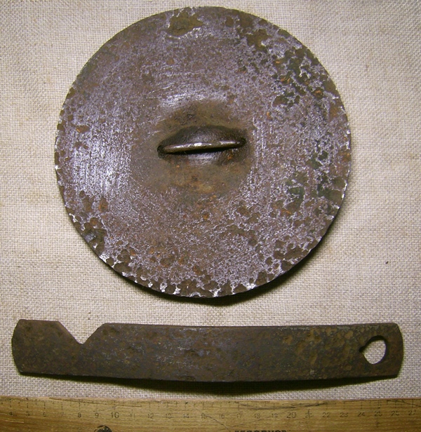 Терзают меня смутные сомнения, номерная деталь от печи? Хотя исключать не стану. Известные блиндажные буржуйки хоть и оснащены похожей приблудой, но она там больше диаметром и менее массивная.