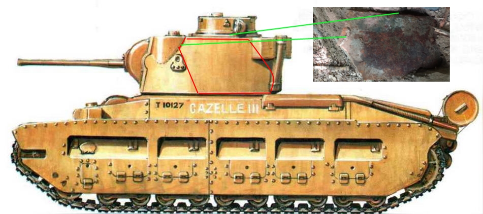 Часть брони с остатками электроприбора это левая защита(экран) гусеницы танка матильда МК-3, со остатком крепления дополнительных траков и корпусом светомаскировочной фары.