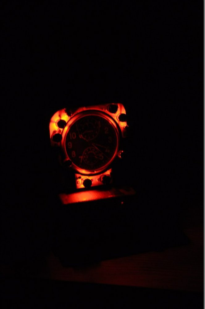 По поводу радиации - у меня часы пробыли пару дней без последствий для организма, потом уехали в РФ, таможню прошли без вопросов (насколько я помню, радиоактивный источник датчиками что в вагоне поезда "засветится", что в авто). Но спасибо за напоминание, предупрежу нового владельца. Теперь по подставке. Кусок приборной панели установлен на корпус какого-то блока, внутри трансформатор на 28В для лампочек + трехпозиционный выключатель сзади (выкл - белый свет - красный свет). Виброгасящие ножки из запчастей. Все по авиационному феншую. А фото в профиль, увы, сделать не догадался. ЗЫ Светомасса уже и не выполняла свою функцию - не светилась. Мб стухли?